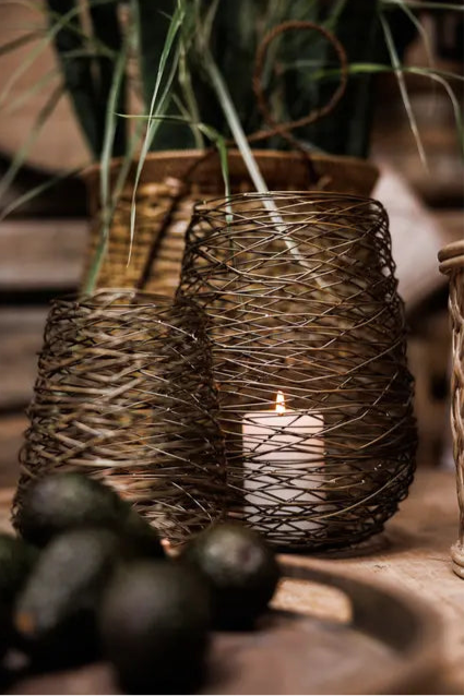 Rund lyslykt av surret metalltråd i en rustikk messingfarge, designet av Halvor Bakke.