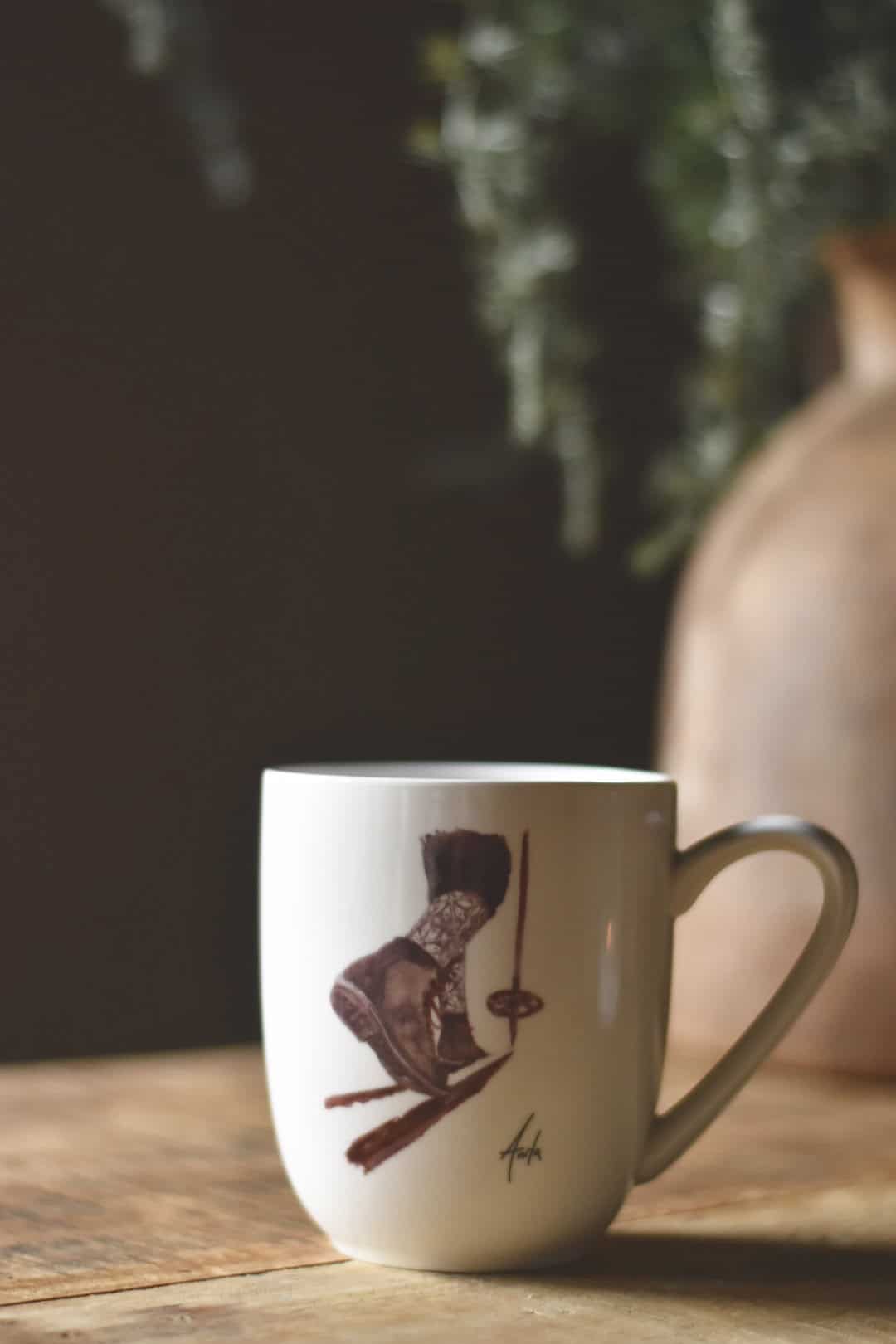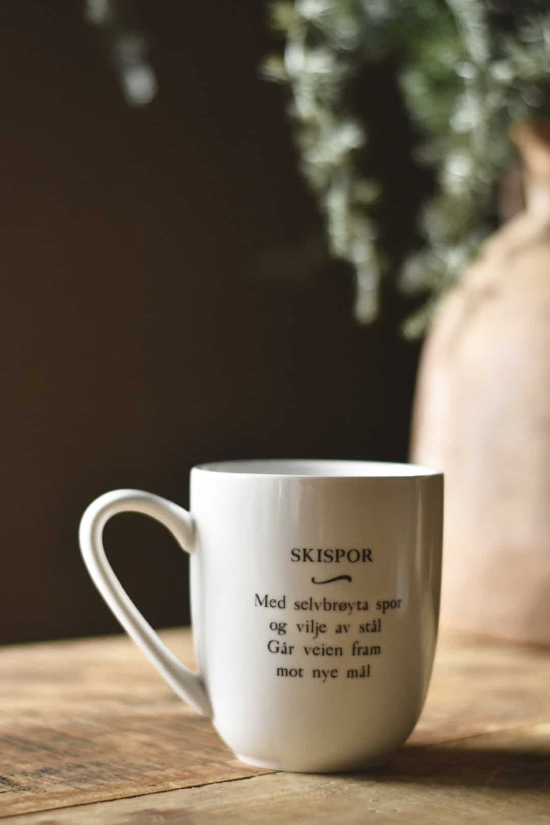 Dette stilfulle kruset er prydet med et vakkert vintage-inspirert motiv av klassiske skistaver, og bringer en følelse av nostalgisk fjellidyll til morgenkaffen eller ettermiddagsteen. Designet er perfekt for skientusiaster og de som elsker den tidløse sjarmen av vintersportens historie.