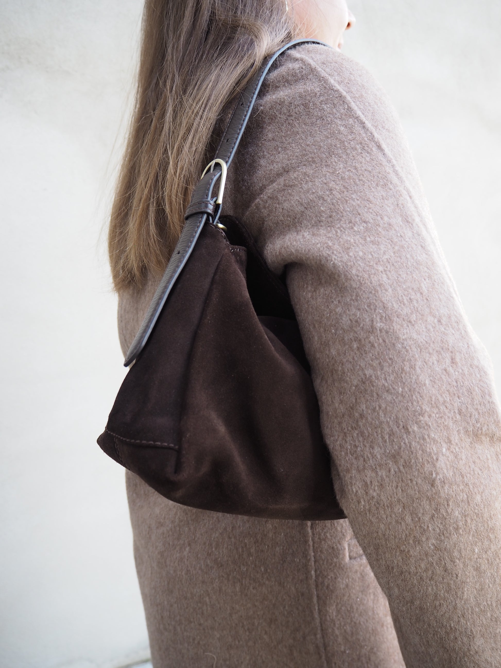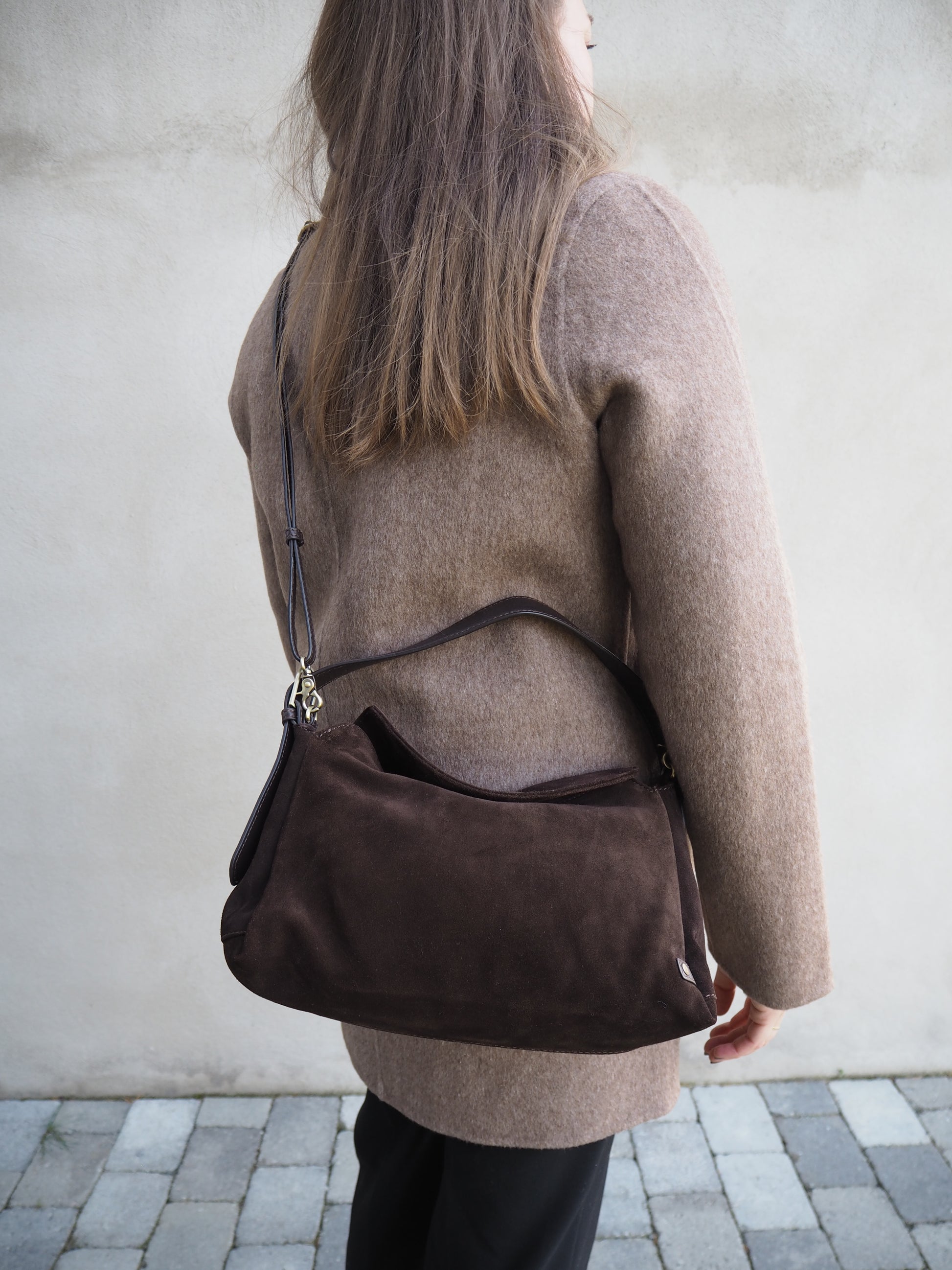 Denne crossover-vesken i semsket skinn er både vakker og funksjonell – et must-have denne sesongen. Den er laget av det mykeste semsket skinn, og har en elegant klafflukking med en magnetisk trykknapp, noe som gir den et rent og sofistikert utseende.