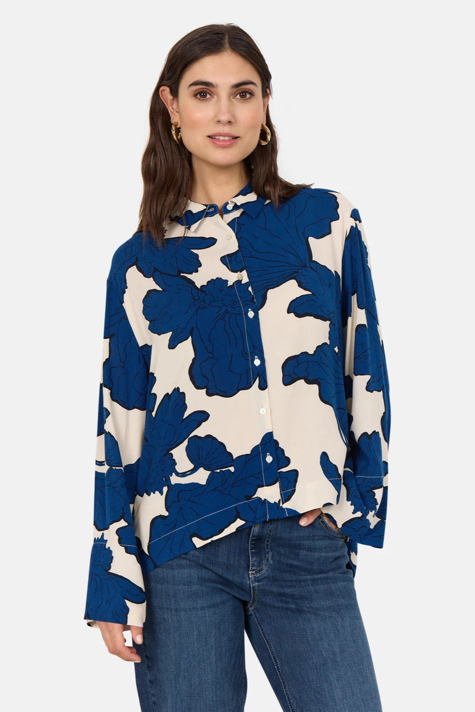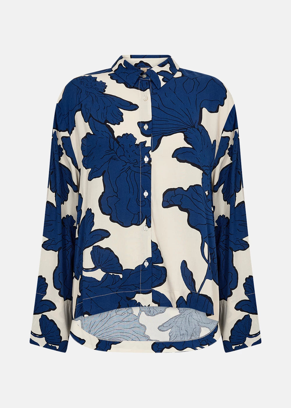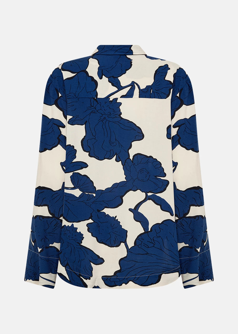 Den har en klassisk krage, knappelukking foran og et dristig blomstertrykk som strekker seg til en litt lengre bakkant. Kombiner denne skjorten med skreddersydde bukser eller jeans for et raffinert utseende.