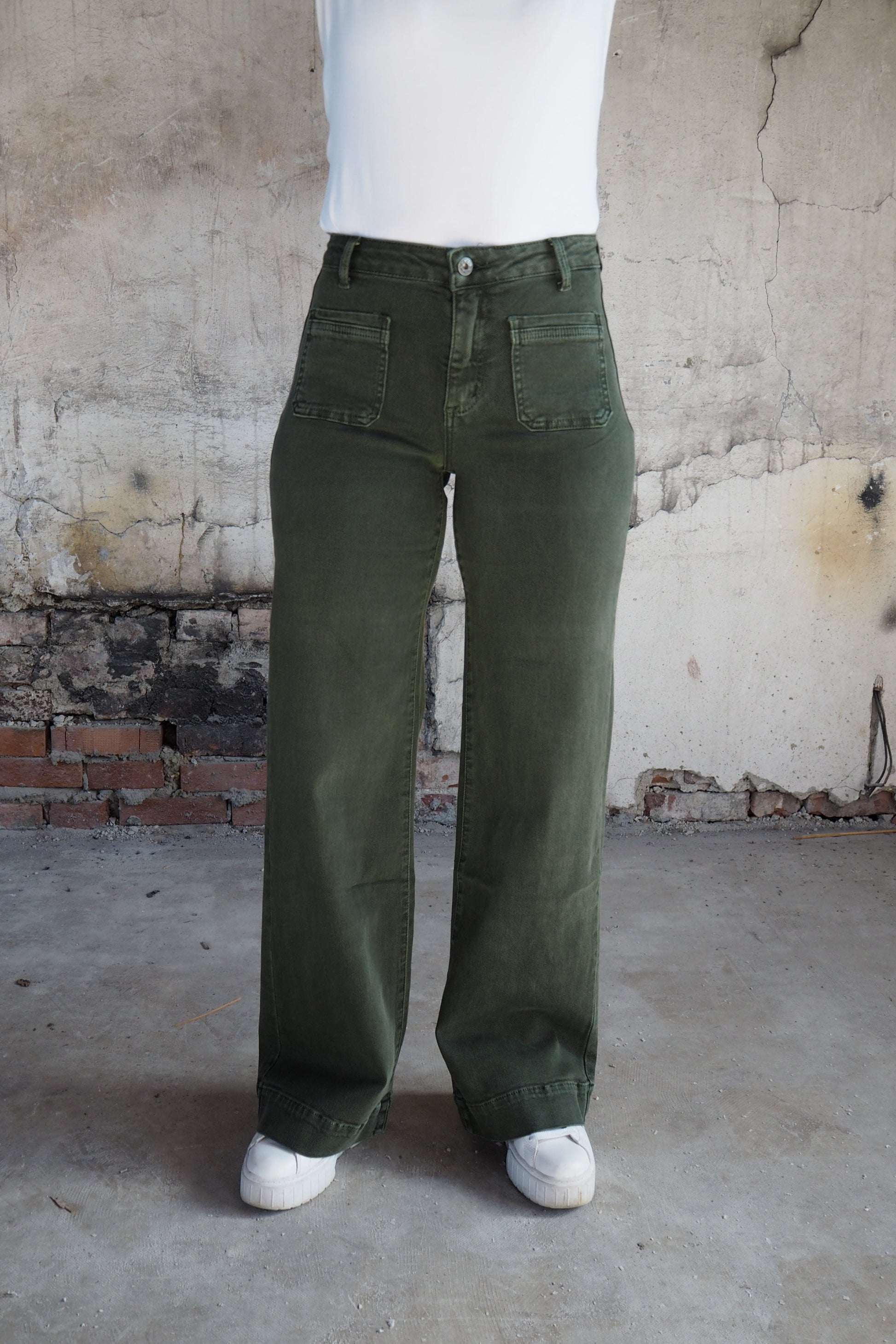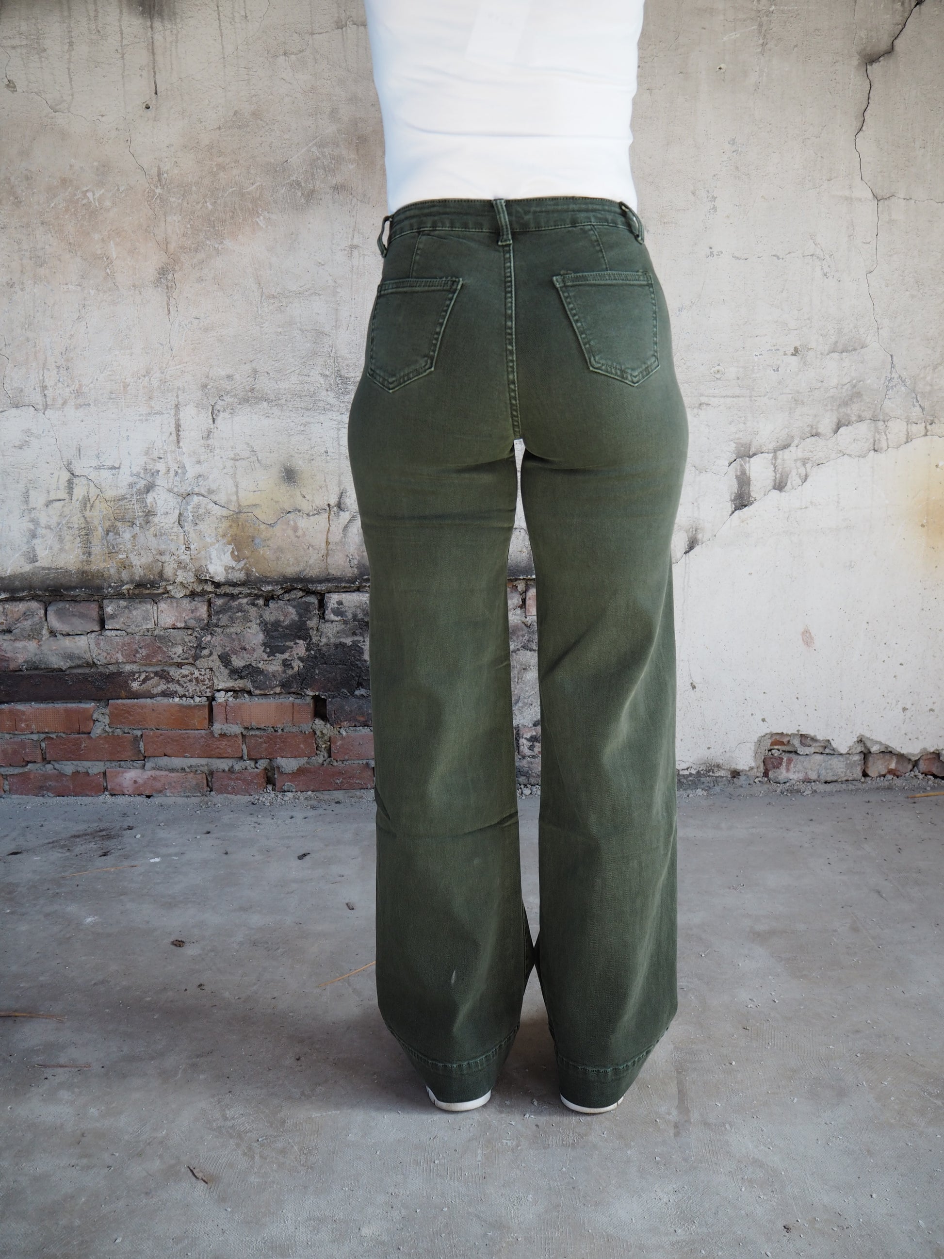 Denne stilrene og komfortable buksen kombinerer klassisk design med moderne detaljer. Laget i en dyp, mørk grønn farge, passer den perfekt til både hverdags- og kontorantrekk. Buksen har høy midje som gir en flatterende passform og lange, rette ben som gir en elegant silhuett.