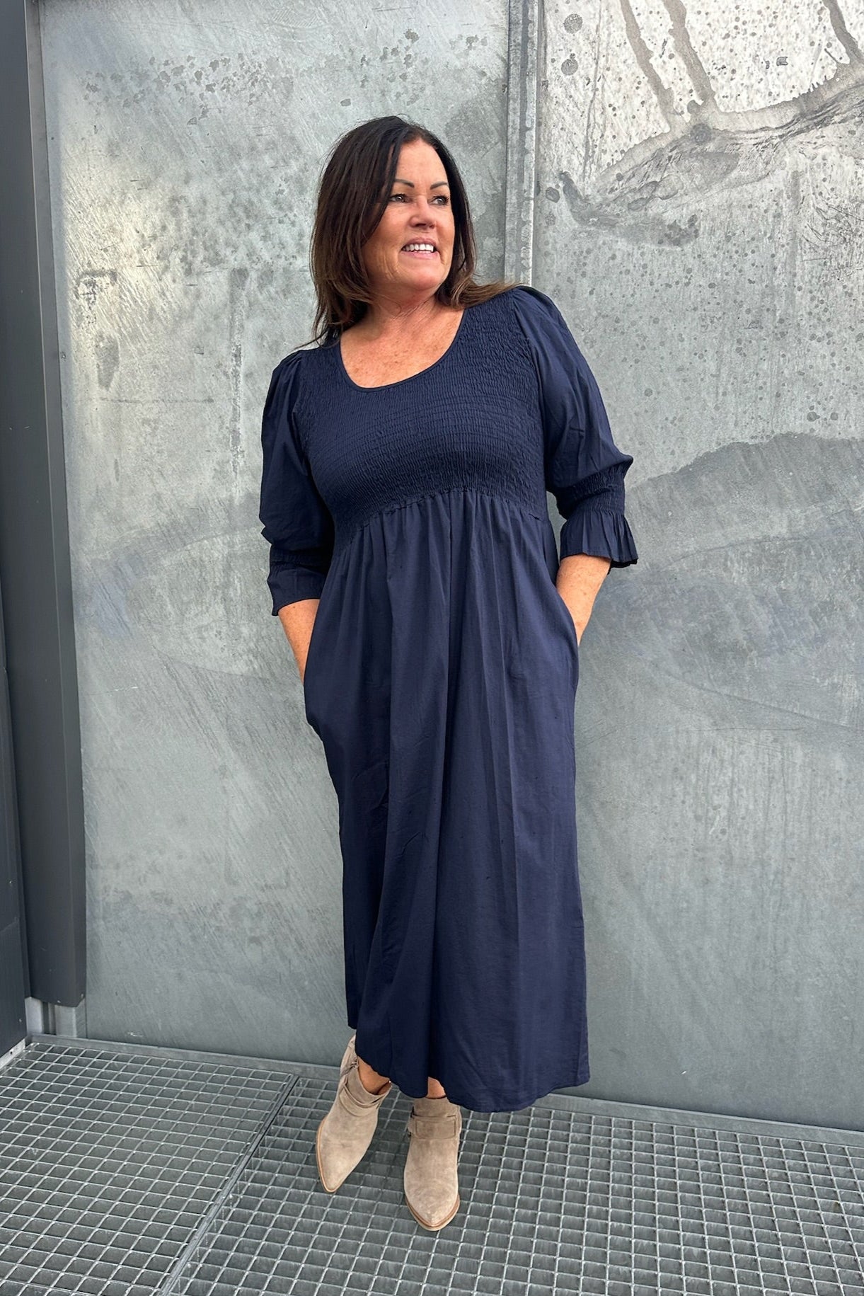 Denne vakre kjolen i myk, strukturert poplin kombinerer komfort og eleganse i en tidløs silhuett. Kjolen har en flatterende, innsvinget overdel med smock-detaljer som fremhever midjen, før den faller løst og ledig ned i et A-formet skjørt som gir god bevegelsesfrihet. Den runde halsen og de lange puffermene med lett rynking gir et feminint uttrykk, mens den dype blåfargen gir kjolen et elegant preg. Perfekt til både hverdags og mer avslappede festlige anledninger, spesielt når den styles med ankelstøvletter som vist her. En allsidig garderobefavoritt for deg som ønsker et behagelig, men stilig antrekk.