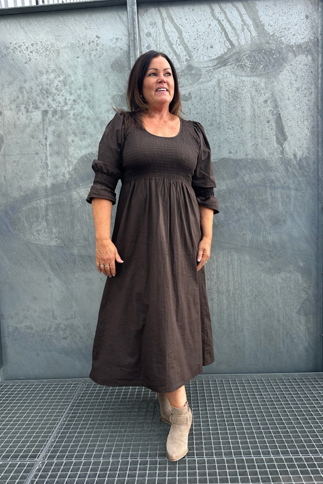 Denne vakre kjolen i myk, strukturert poplin kombinerer komfort og eleganse i en tidløs silhuett. Kjolen har en flatterende, innsvinget overdel med smock-detaljer som fremhever midjen, før den faller løst og ledig ned i et A-formet skjørt som gir god bevegelsesfrihet. Den runde halsen og de lange puffermene med lett rynking gir et feminint uttrykk, mens den dype brunfargen gir kjolen et naturlig, jordnært preg. Perfekt til både hverdags og mer avslappede festlige anledninger, spesielt når den styles med ankelstøvletter som vist her. En allsidig garderobefavoritt for deg som ønsker et behagelig, men stilig antrekk.