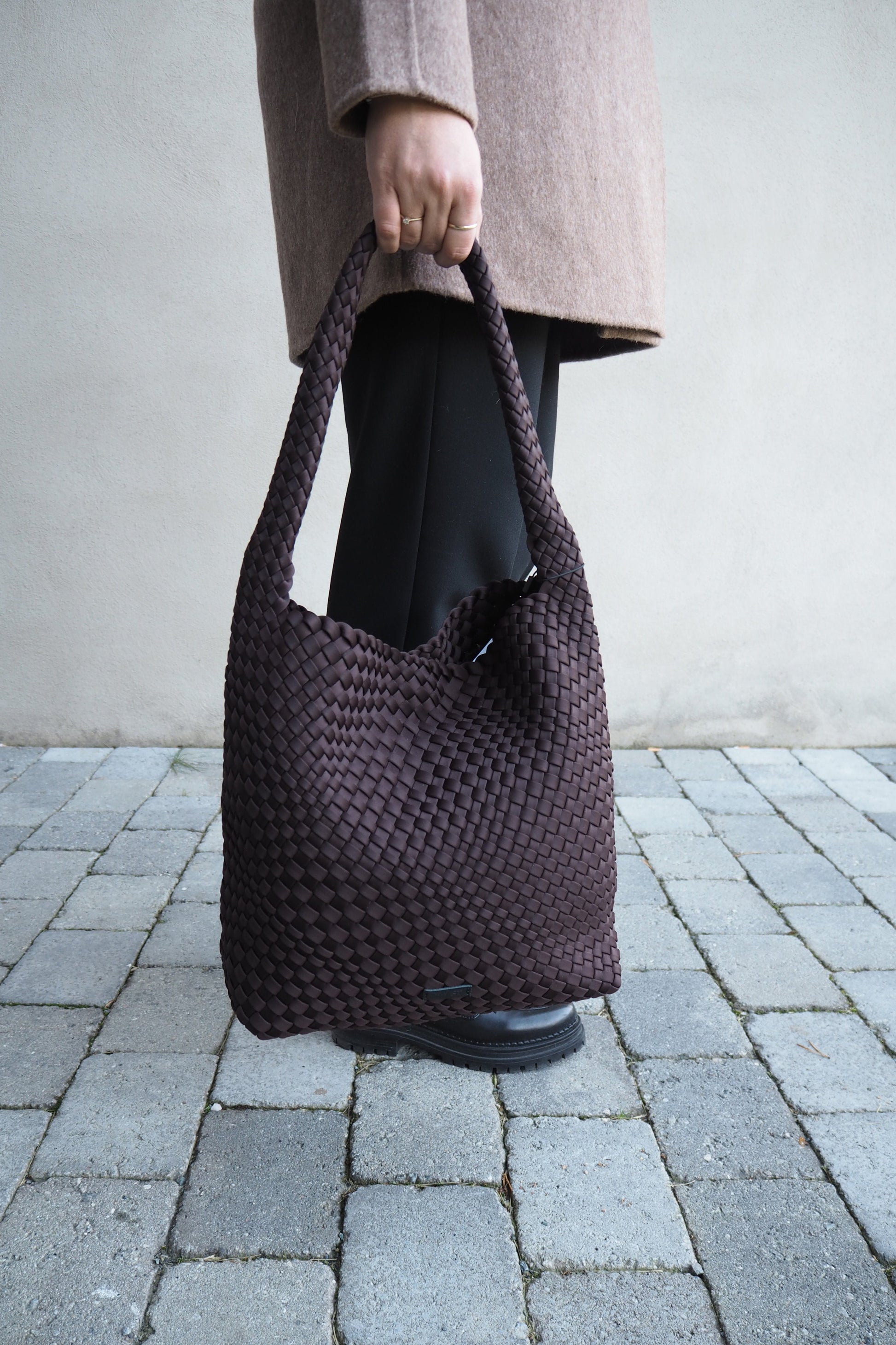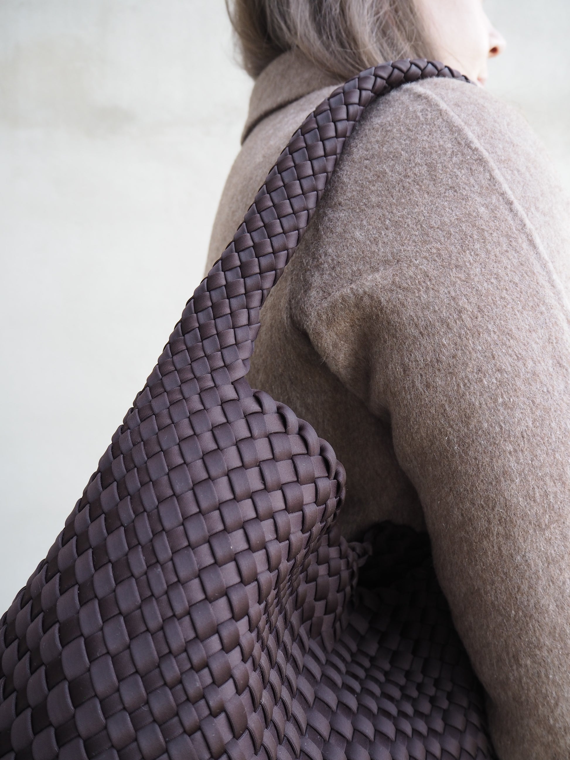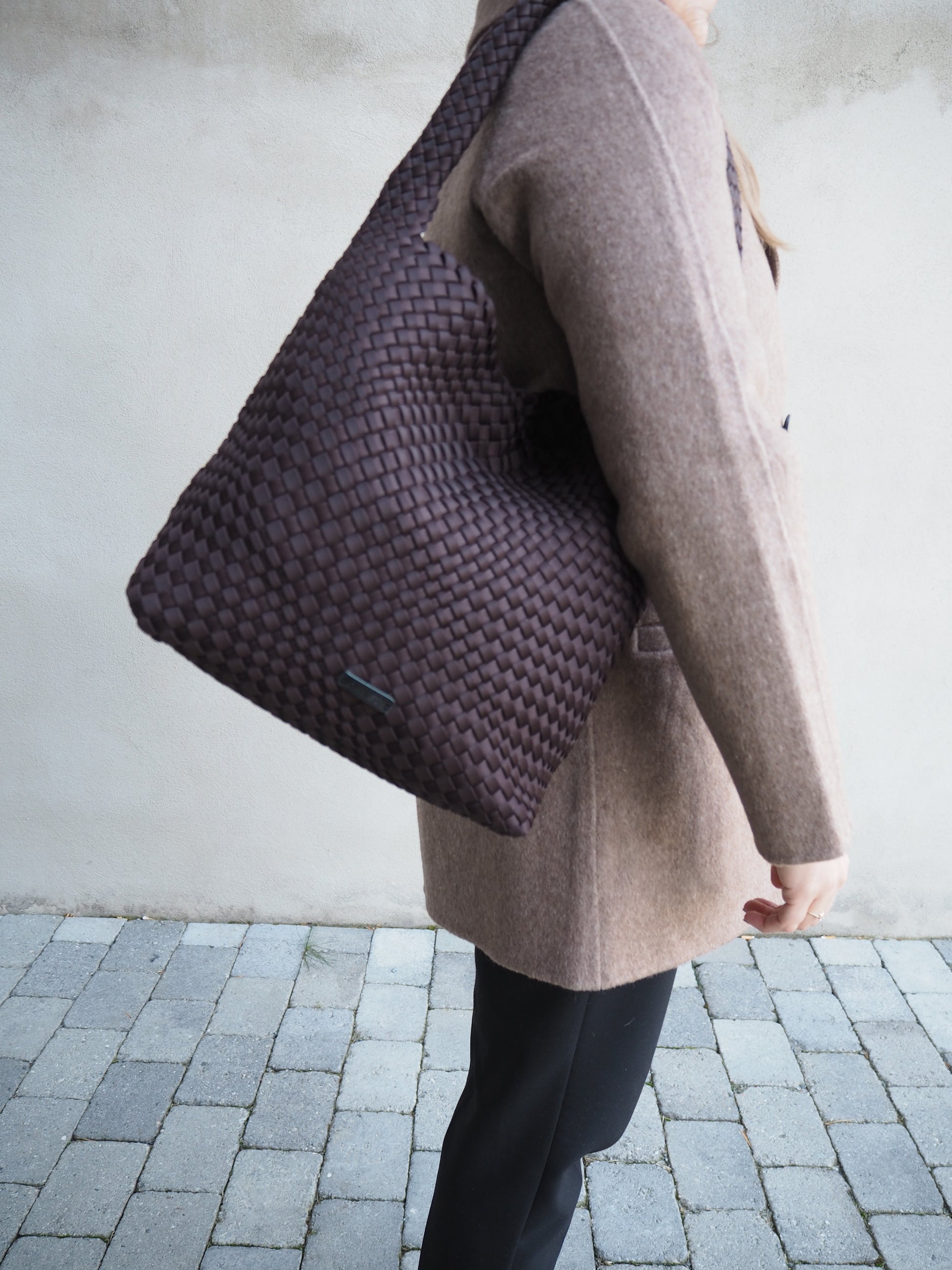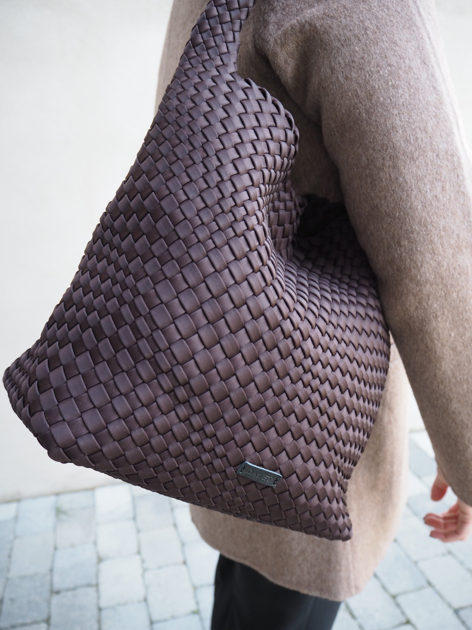 En romslig skulderveske med et karakteristisk utseende. Vesken er håndvevd i ett stykke neoprenmateriale som er både mykt og strukturert på samme tid. Den lukkes med en skjult magnet og har en fast bunn som sikrer en stabil form. En moderne veske som kombinerer funksjon og form i ett og samme uttrykk.