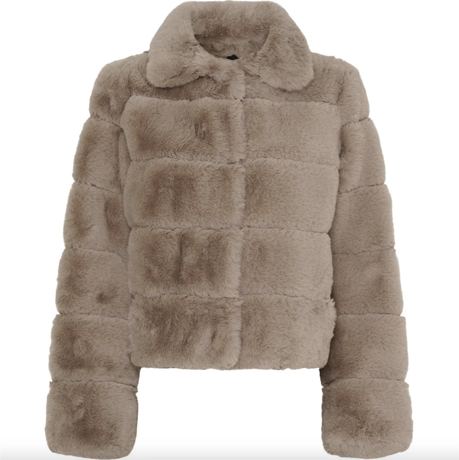 Laget i en ekstra myk fuskepels (100 % polyester) som føles luksuriøs og deilig å ha på. Jakken har regular fit, klassisk krage, sidelommer og lukkes med diskré trykknapper foran. Et nydelig designelement gir jakken det lille ekstra – perfekt for både hverdagsbruk og spesielle anledninger.