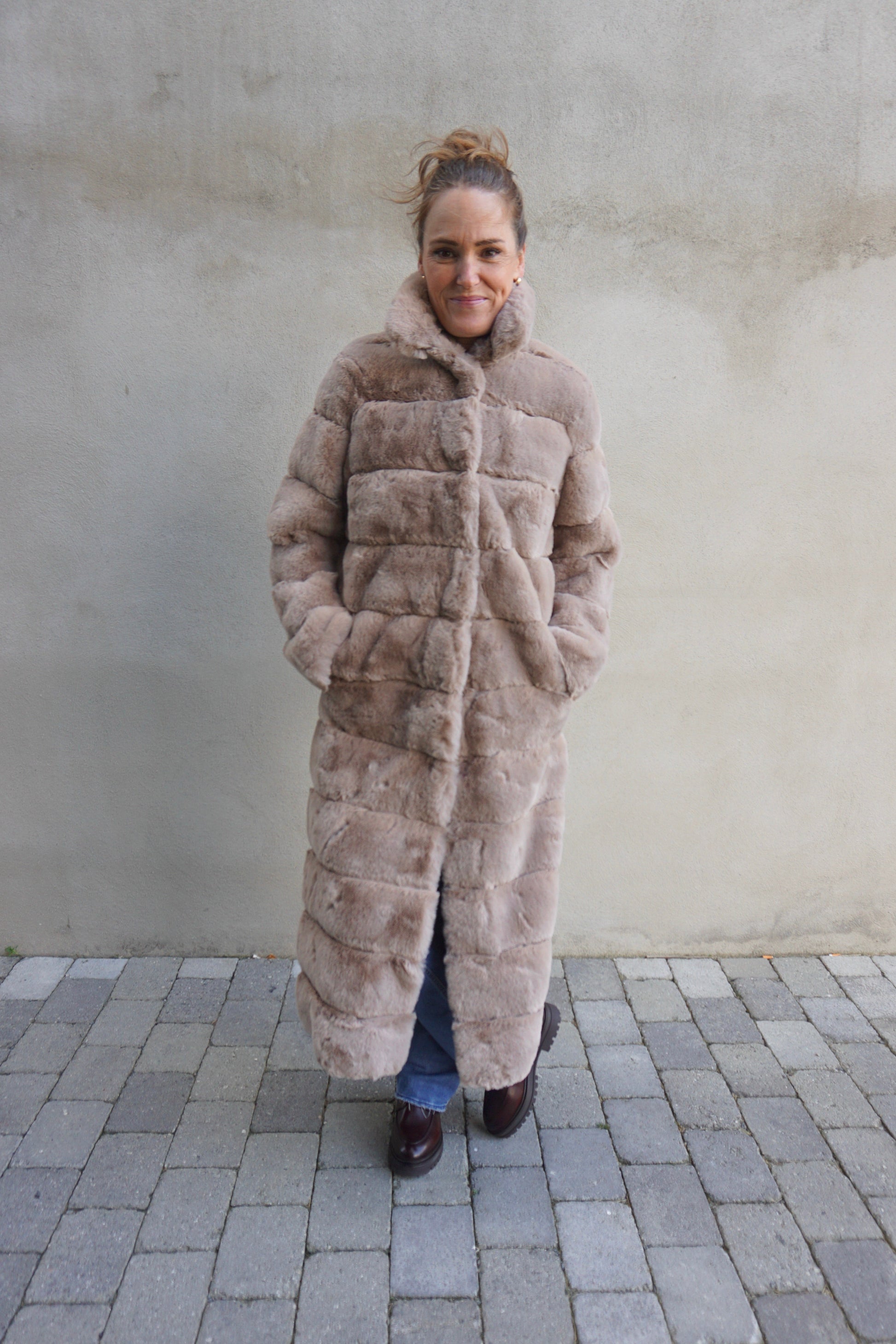 Kåpen er laget i myk og luksuriøs fuskepels (100 % polyester), og har normal passform, klassisk krage, sidelommer og knappelukking foran. Lengden er flatterende og gir et sofistikert uttrykk som løfter ethvert antrekk – perfekt over både kjoler og bukser.