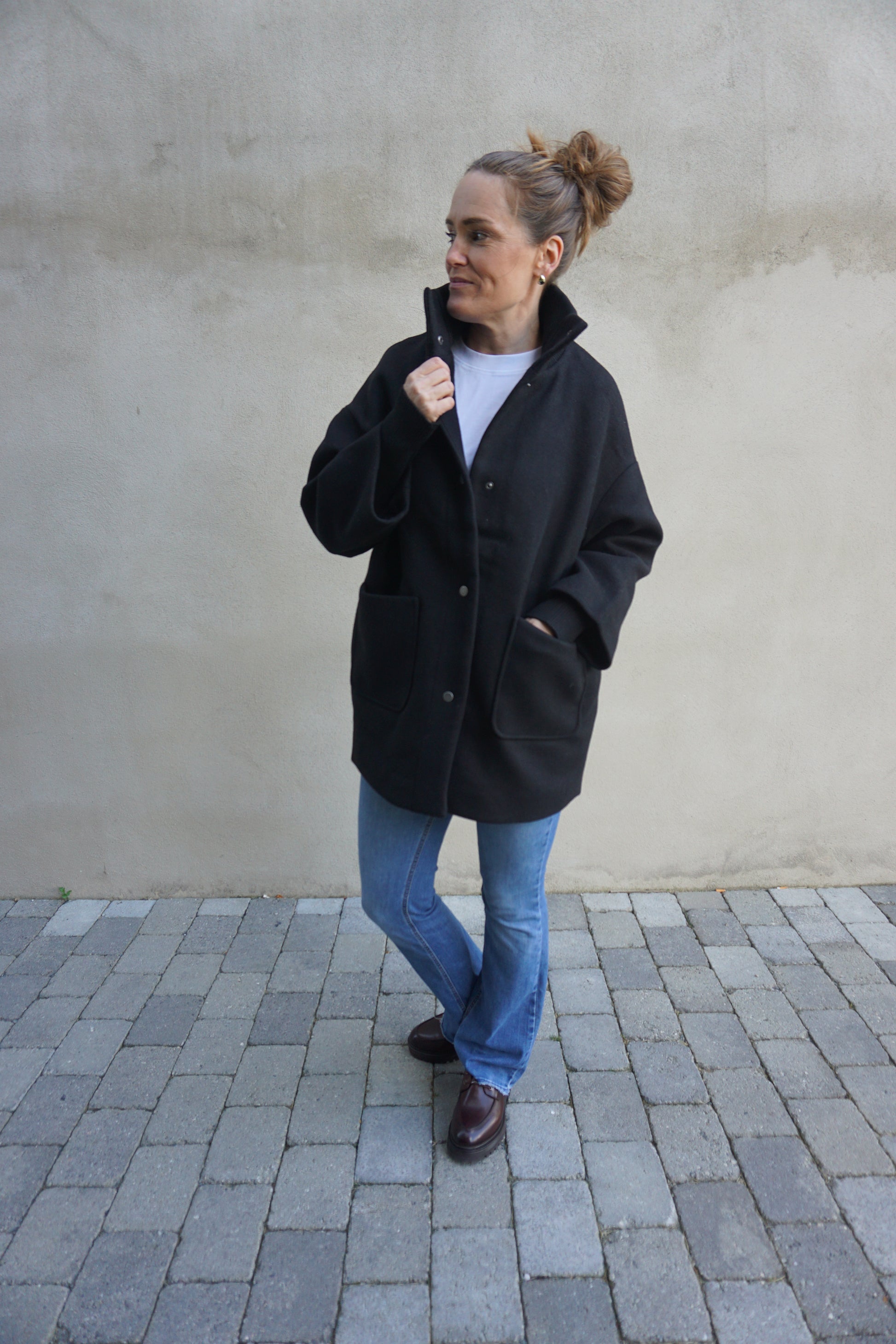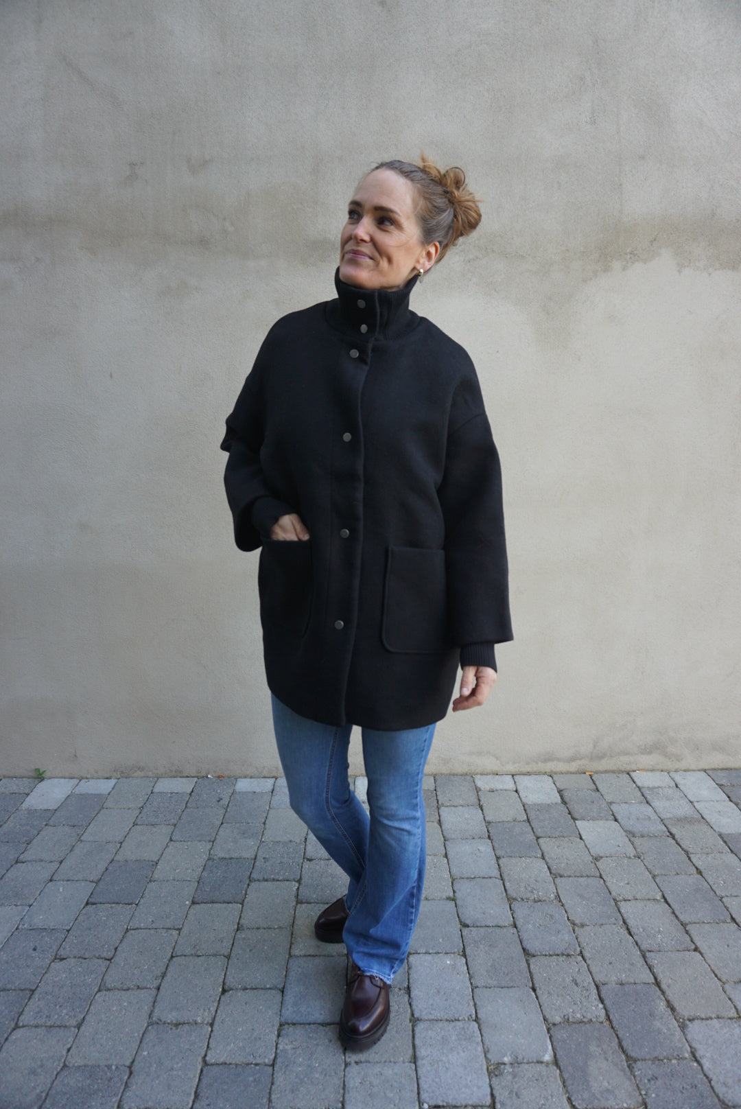 SC-Asta 8 jakken har en høy, ribbestrikket krage og en lett forlenget bakside, som gir både stil og komfort. Trykknappene sikrer en god lukking, mens de store frontlommene gir praktisk bruk. Ullblandingen sørger for varme, noe som gjør den ideell for kjøligere vær. Bruk den sammen med smale bukser og ankelstøvler for et elegant og balansert utseende.