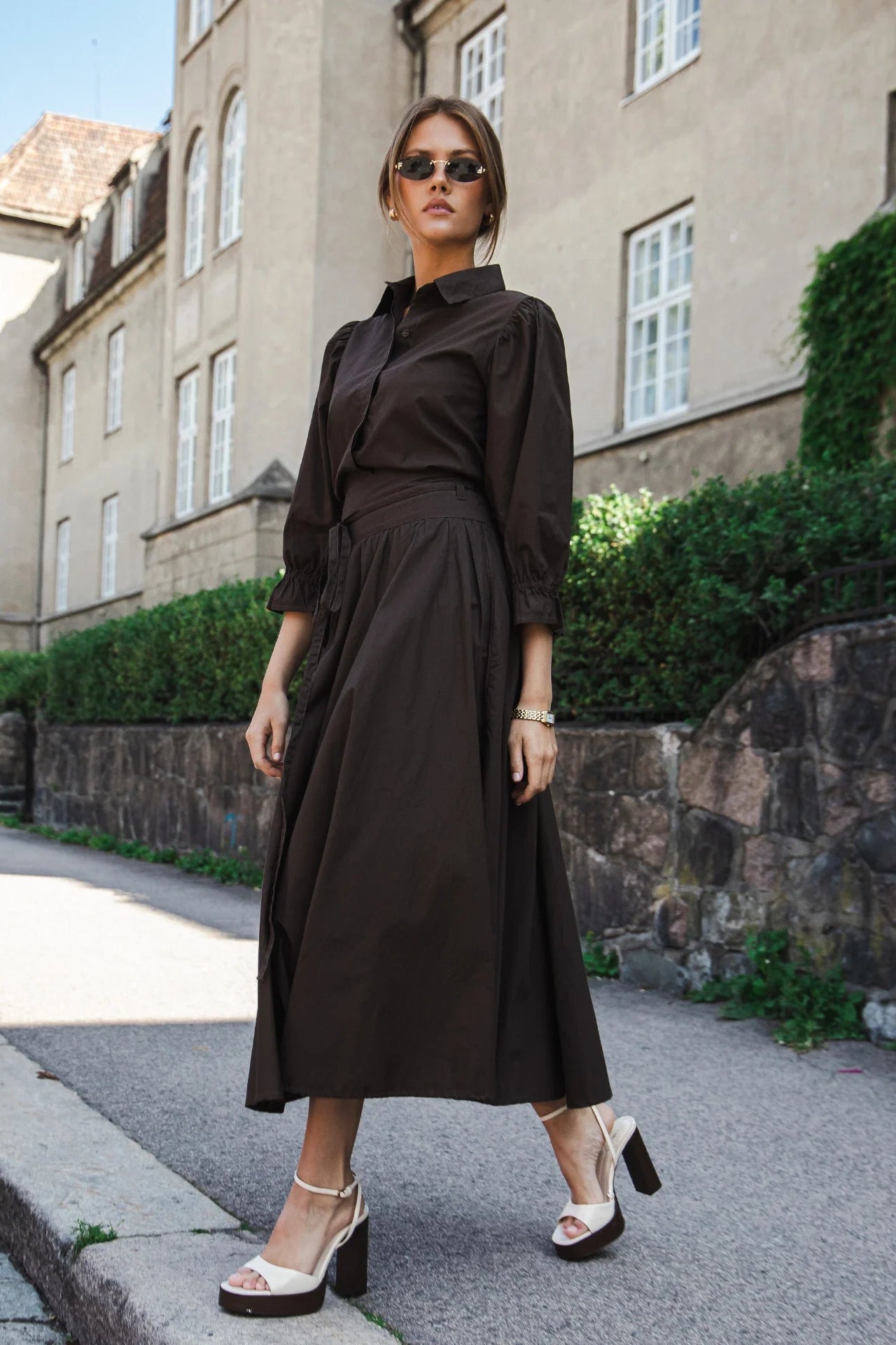 Vi introduserer Astrid-skjørtet i 100 % bomullspoplin. Det har midilengde, en tettsittende midje med vaffelsøm bak og et avtakbart belte. En komfortabel passform som er normal i størrelsen. Velg din vanlige størrelse.