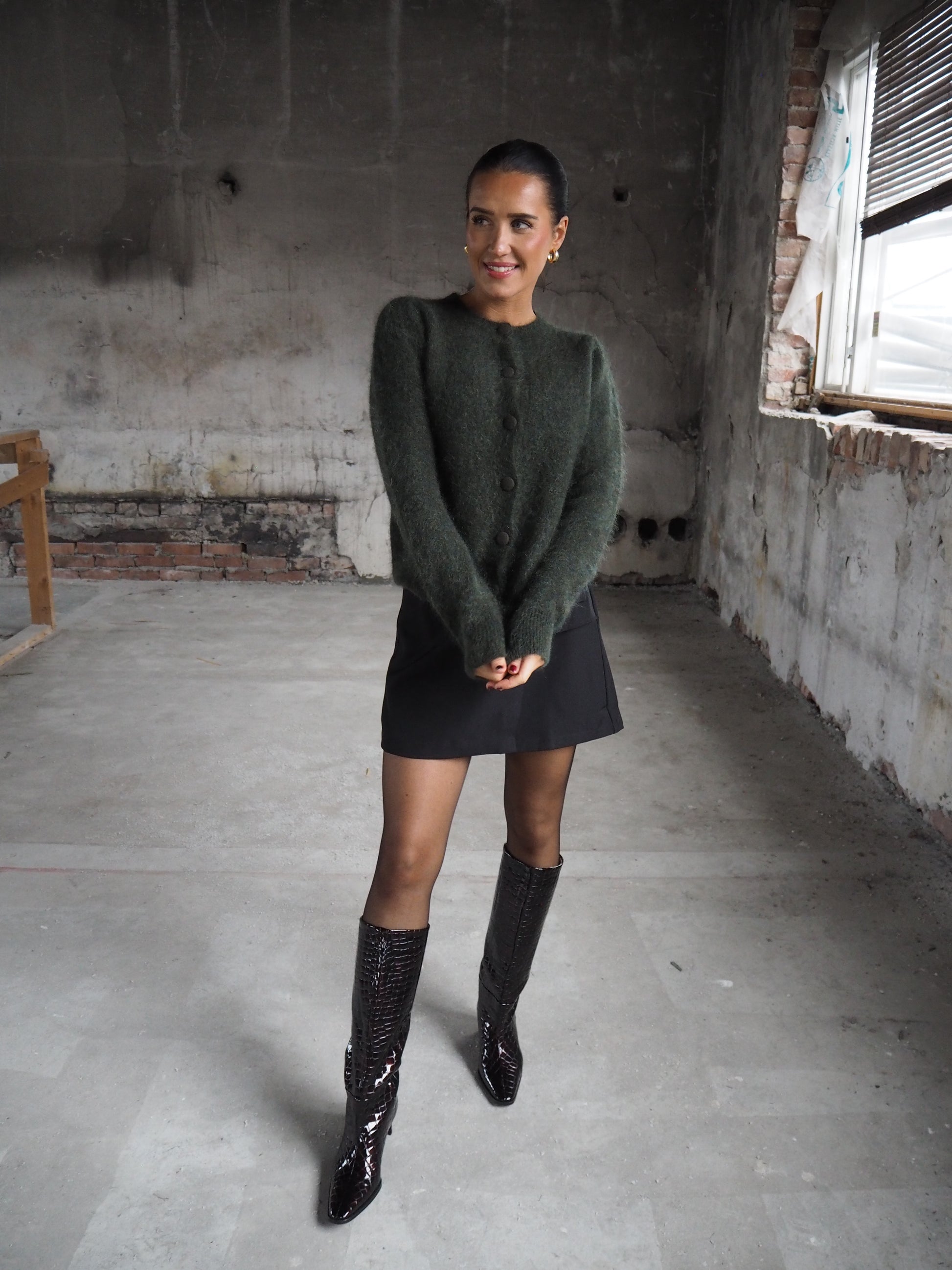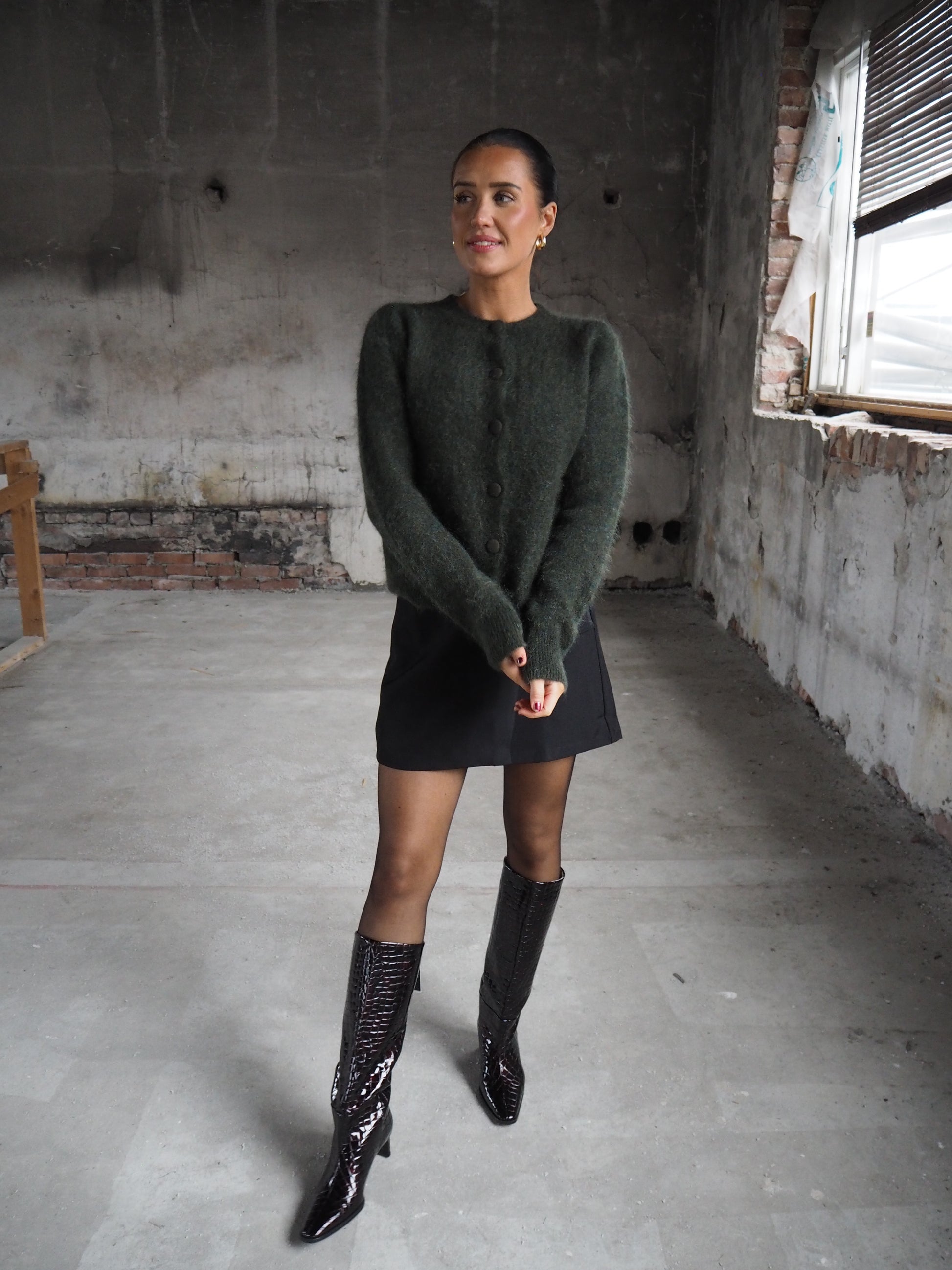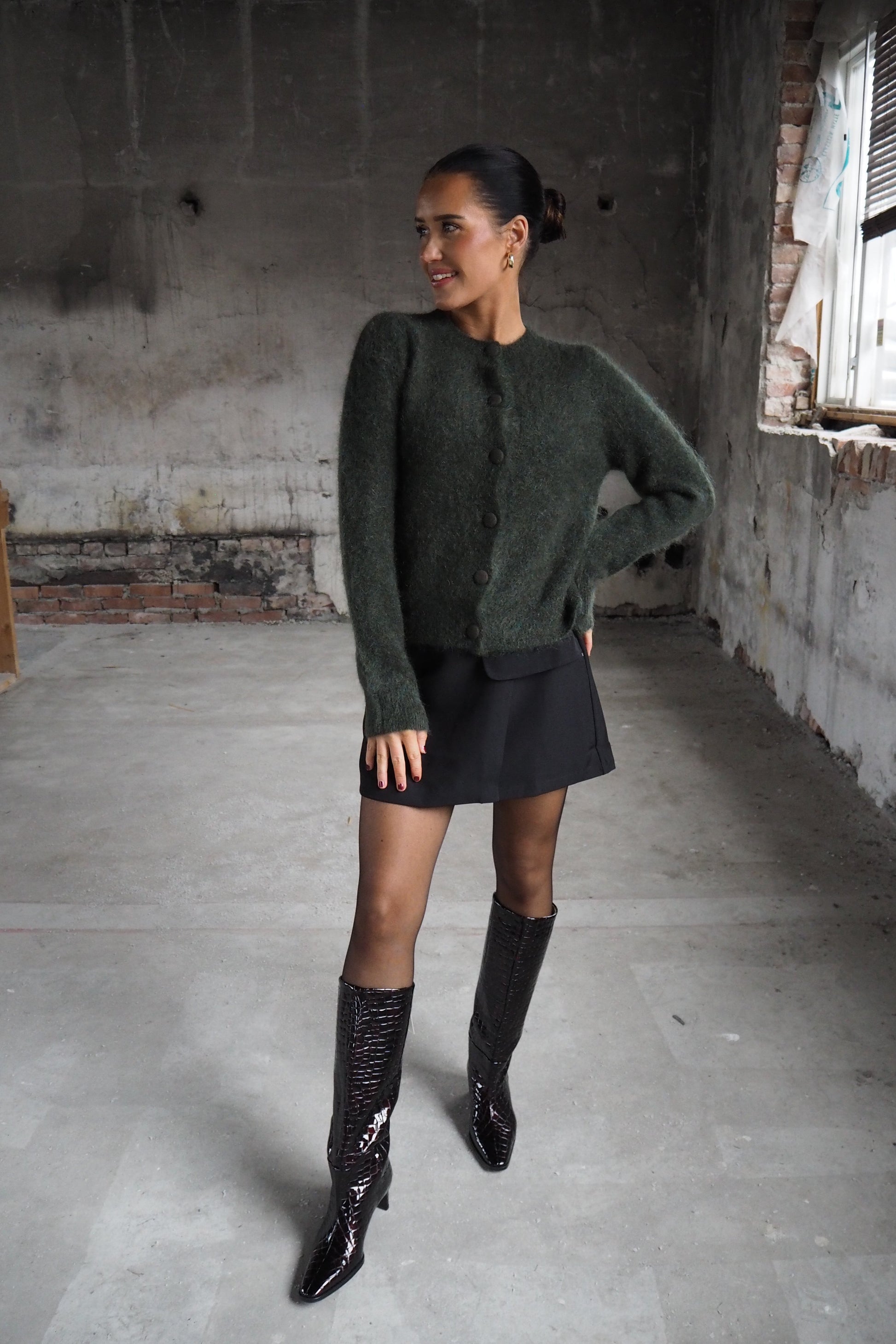Ulla Mohair Cardigan i taupe er et stilrent og komfortabelt plagg som tilfører et elegant preg til enhver garderobe. Den myke blandingen av mohair og ull gir en luksuriøs følelse, perfekt for kjøligere dager.