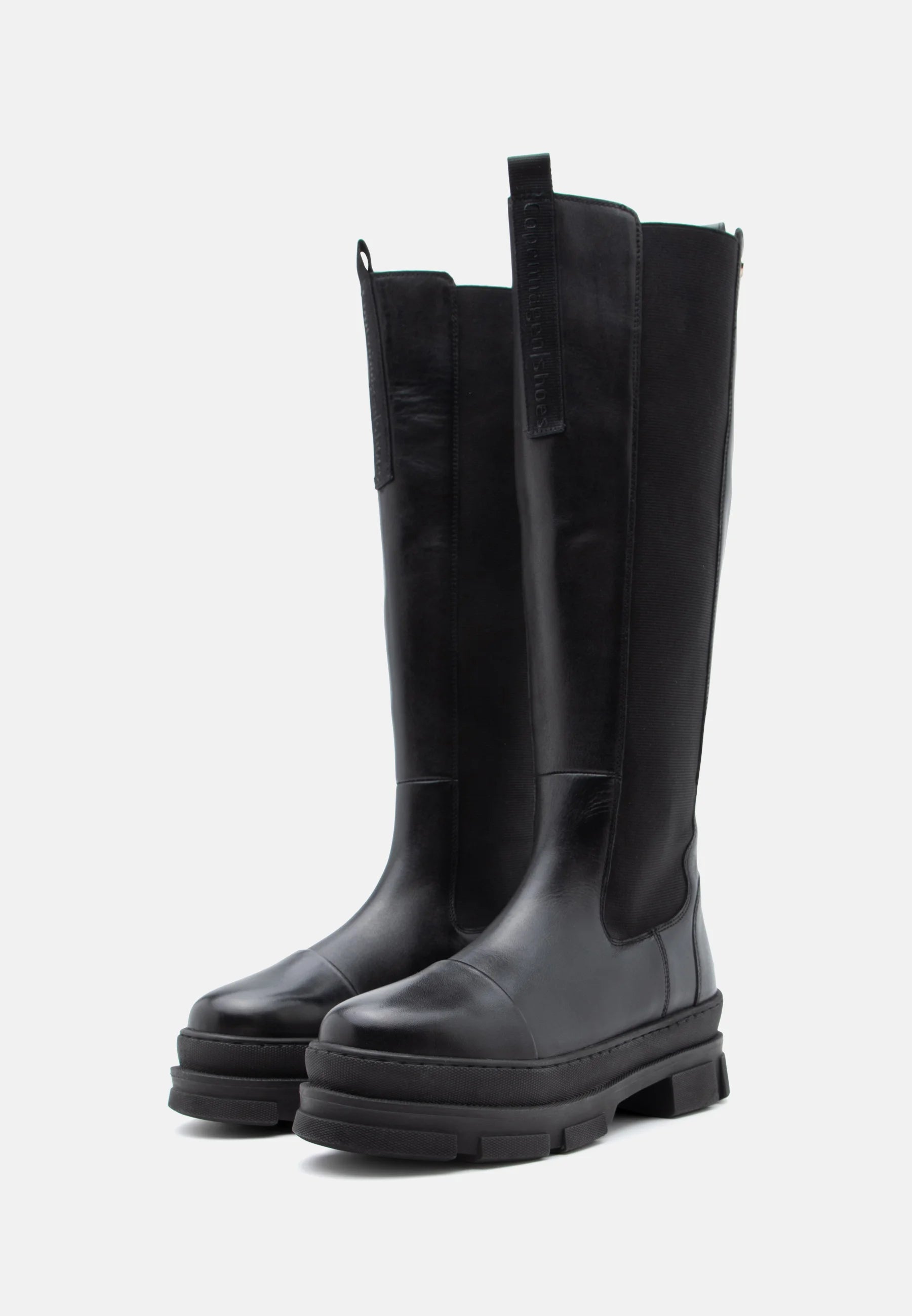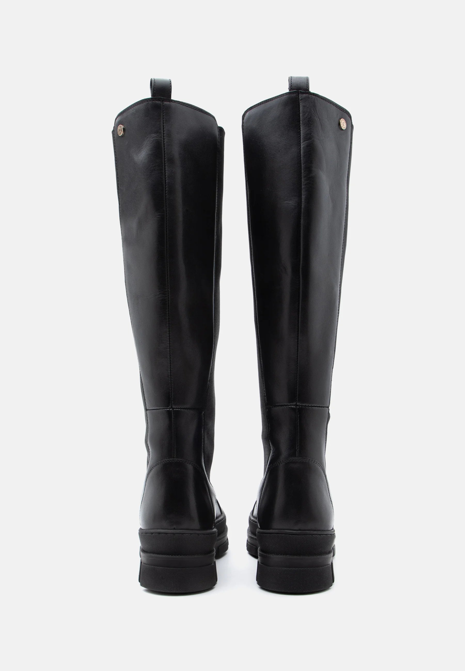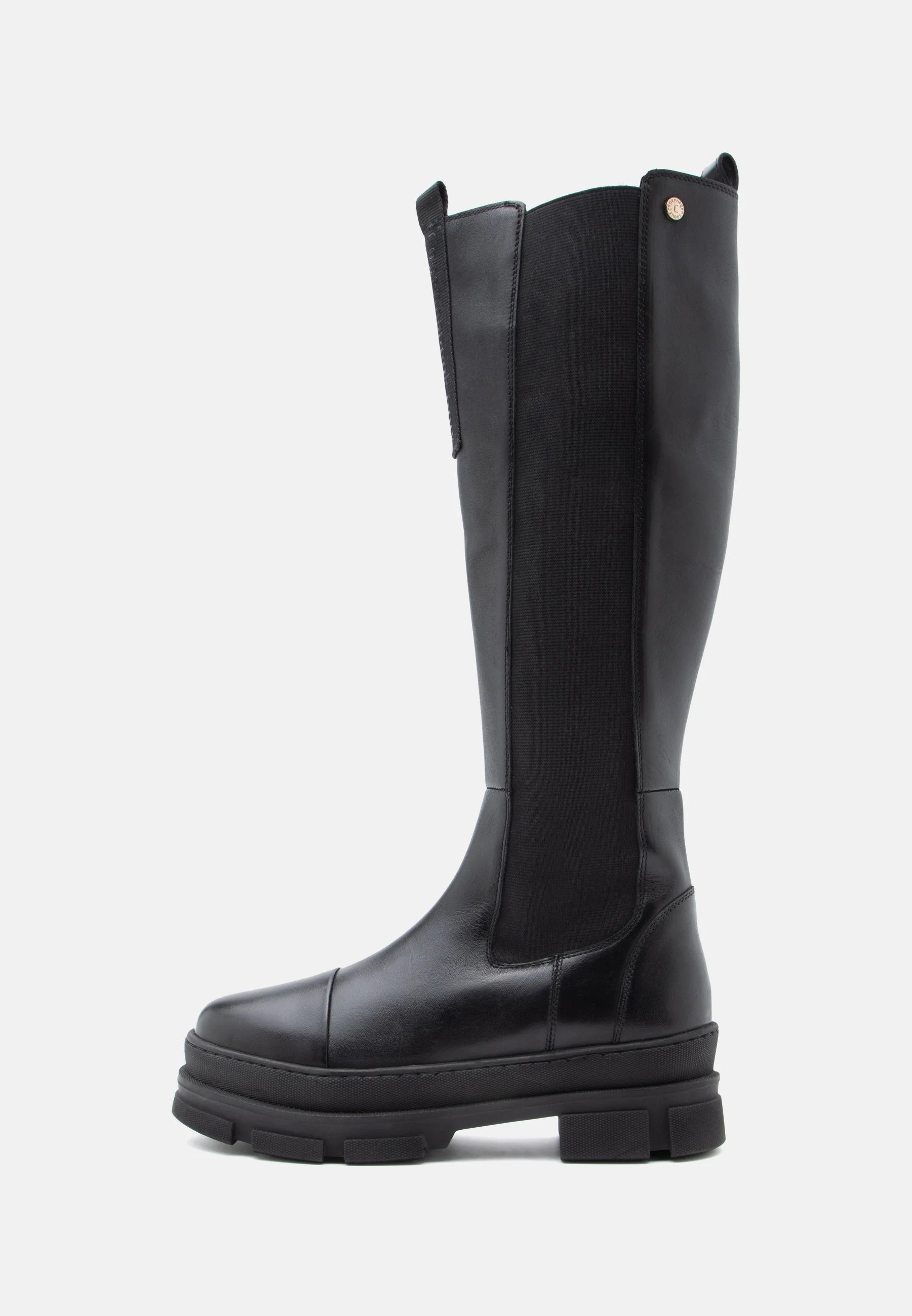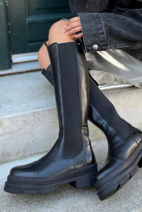 Denne svarte statement-støvelen har et elegant og enkelt utseende med matchende svarte sømmer og strikk – en tidløs støvel som passer til alt i garderoben. Perfekt for de som ønsker en klassisk høy støvel med et moderne preg.
