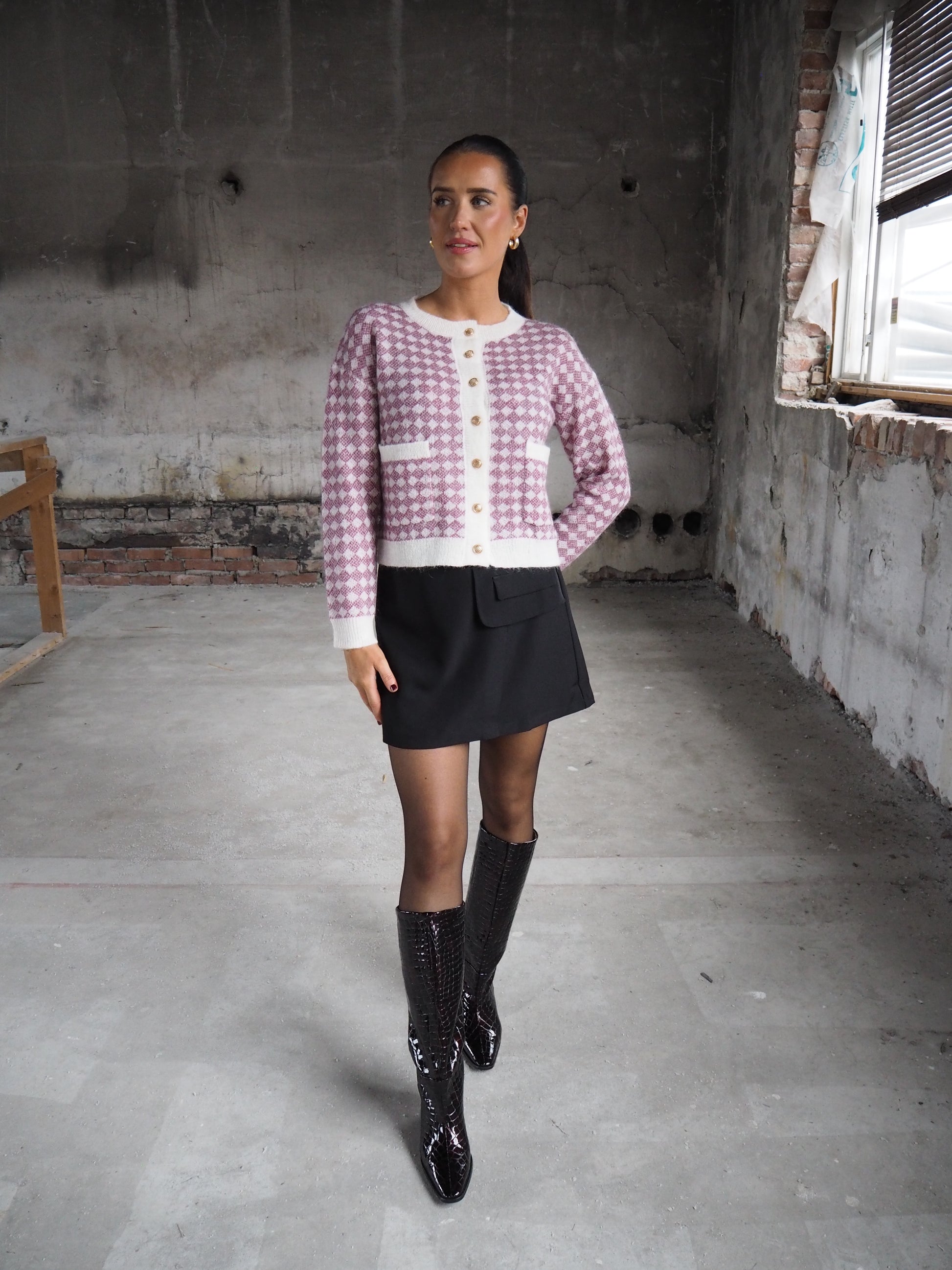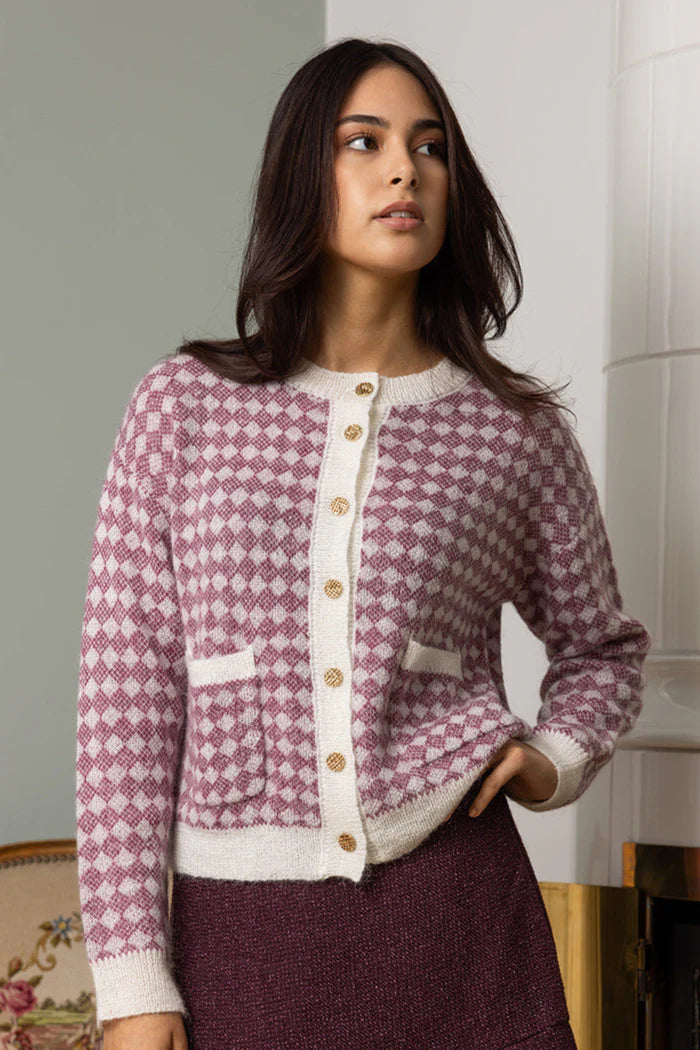 Klara Knit Cardigan er en myk og feminin strikket jakke i delikat mønsterstrikk. Den har et klassisk rutemønster i burgunder og offwhite, kombinert med dekorative gullknapper som tilfører et eksklusivt preg. Cardiganen har en tidløs, rett fasong med lommer foran og kontrastkanter som gir et raffinert uttrykk. Perfekt å bruke både alene eller lag-på-lag over en bluse eller kjole.