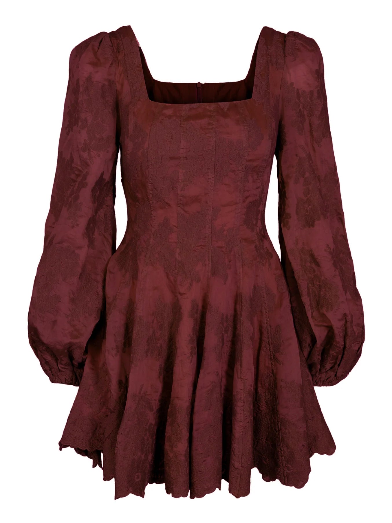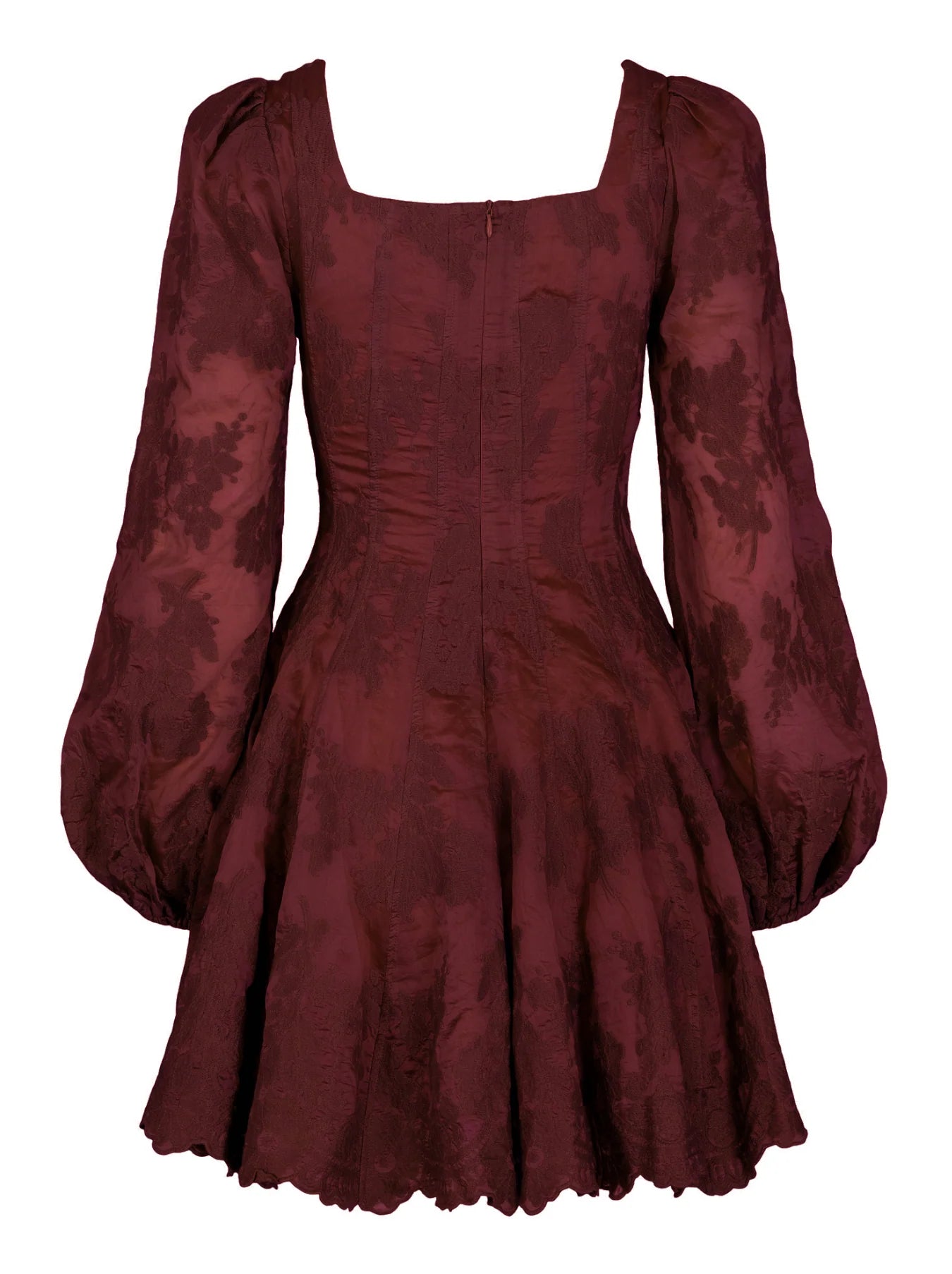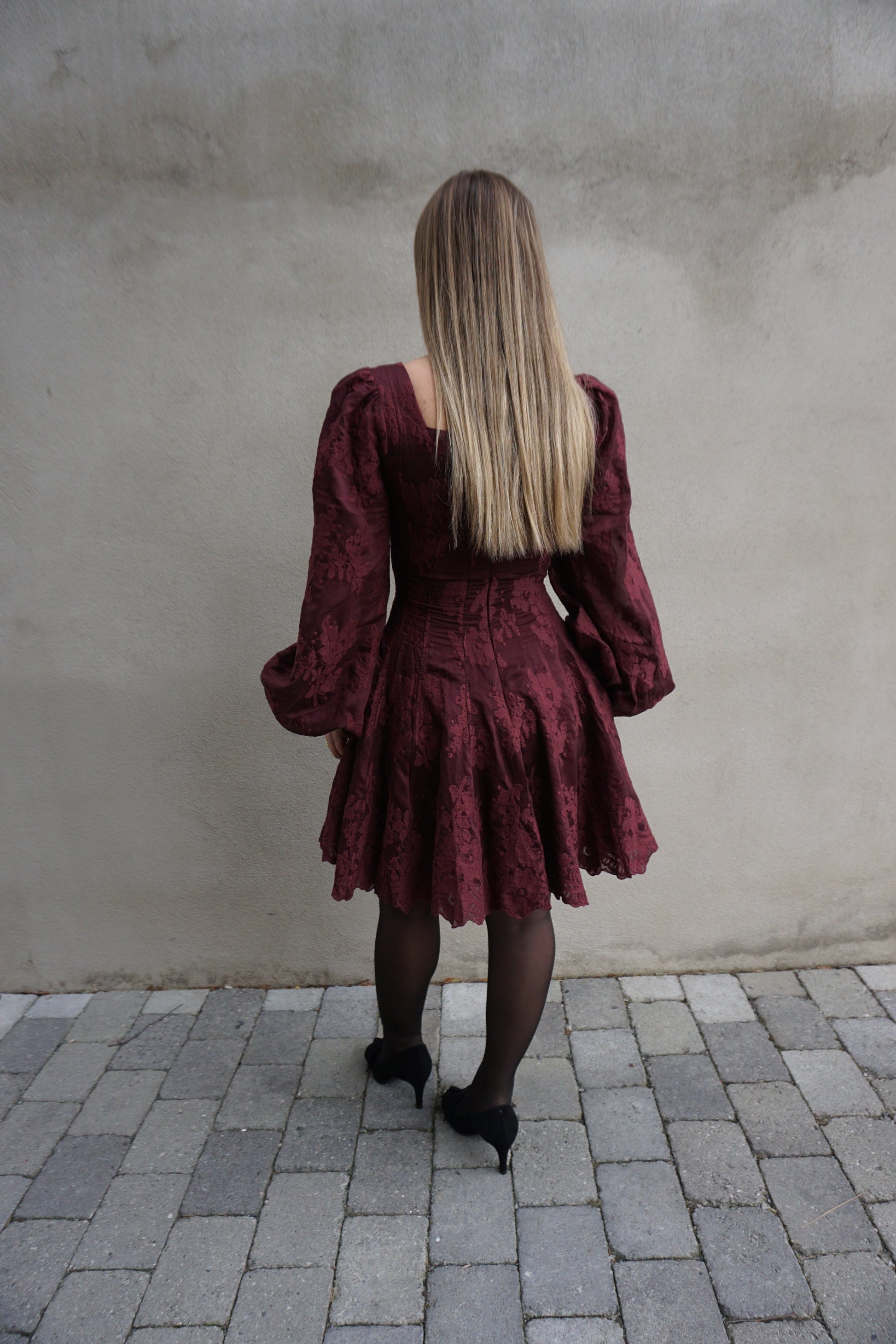 Kjolen har en elegant utringning både foran og bak som fremhever silhuetten på en raffinert måte. Ermene har strikk som gir en lett puff, og den skjulte glidelåsen i ryggen gjør at kjolen sitter pent uten å forstyrre helhetsinntrykket.