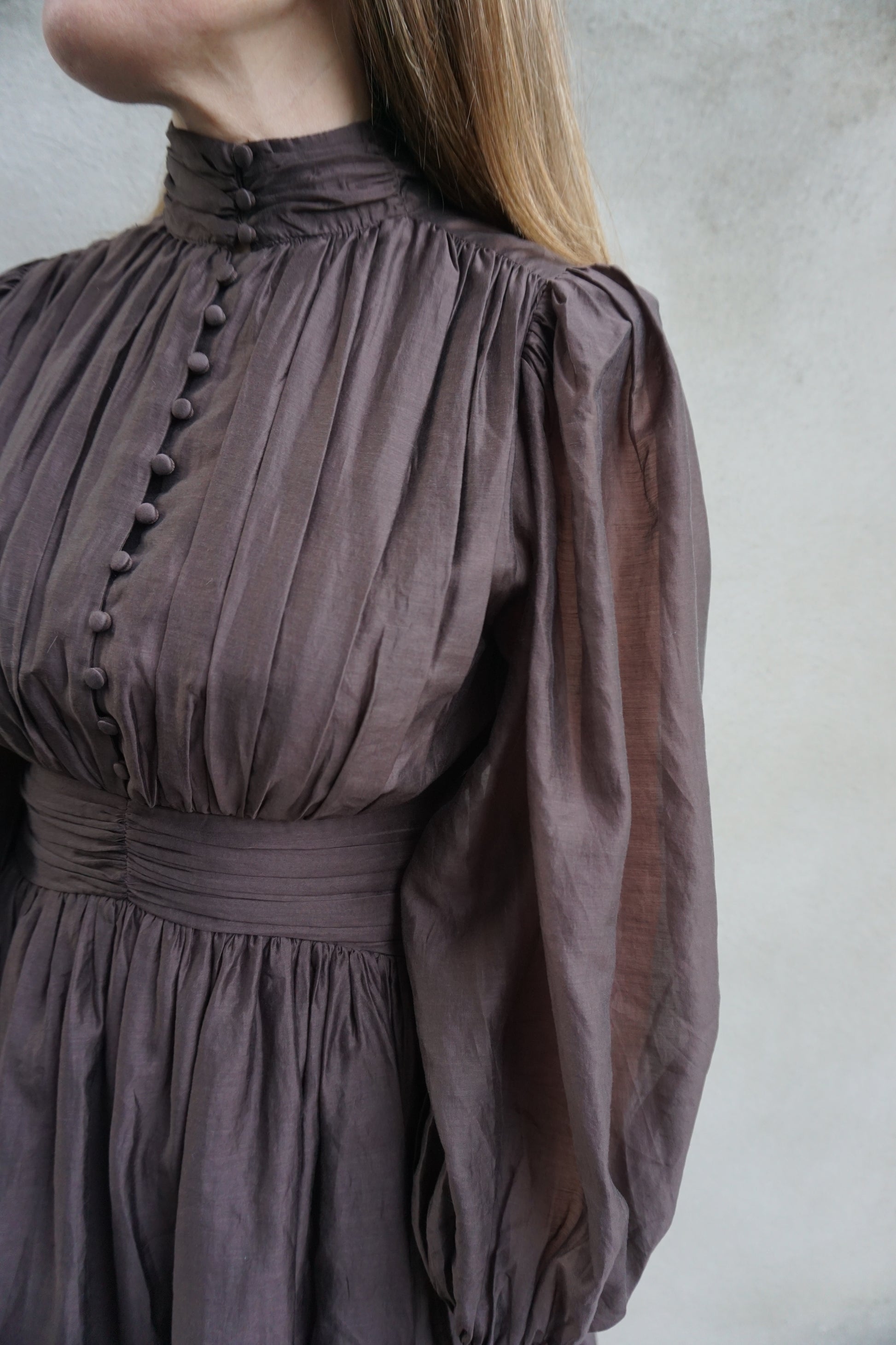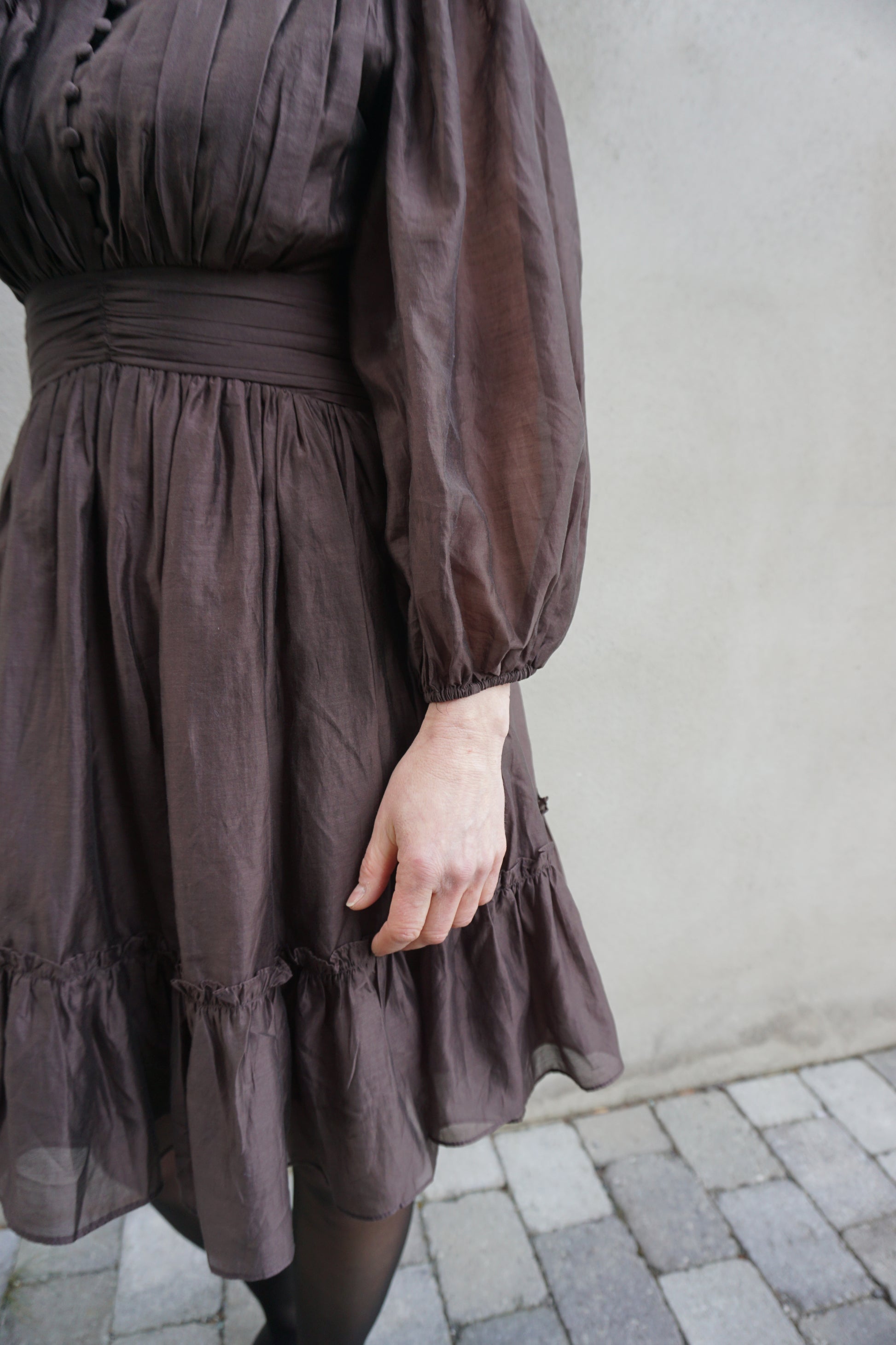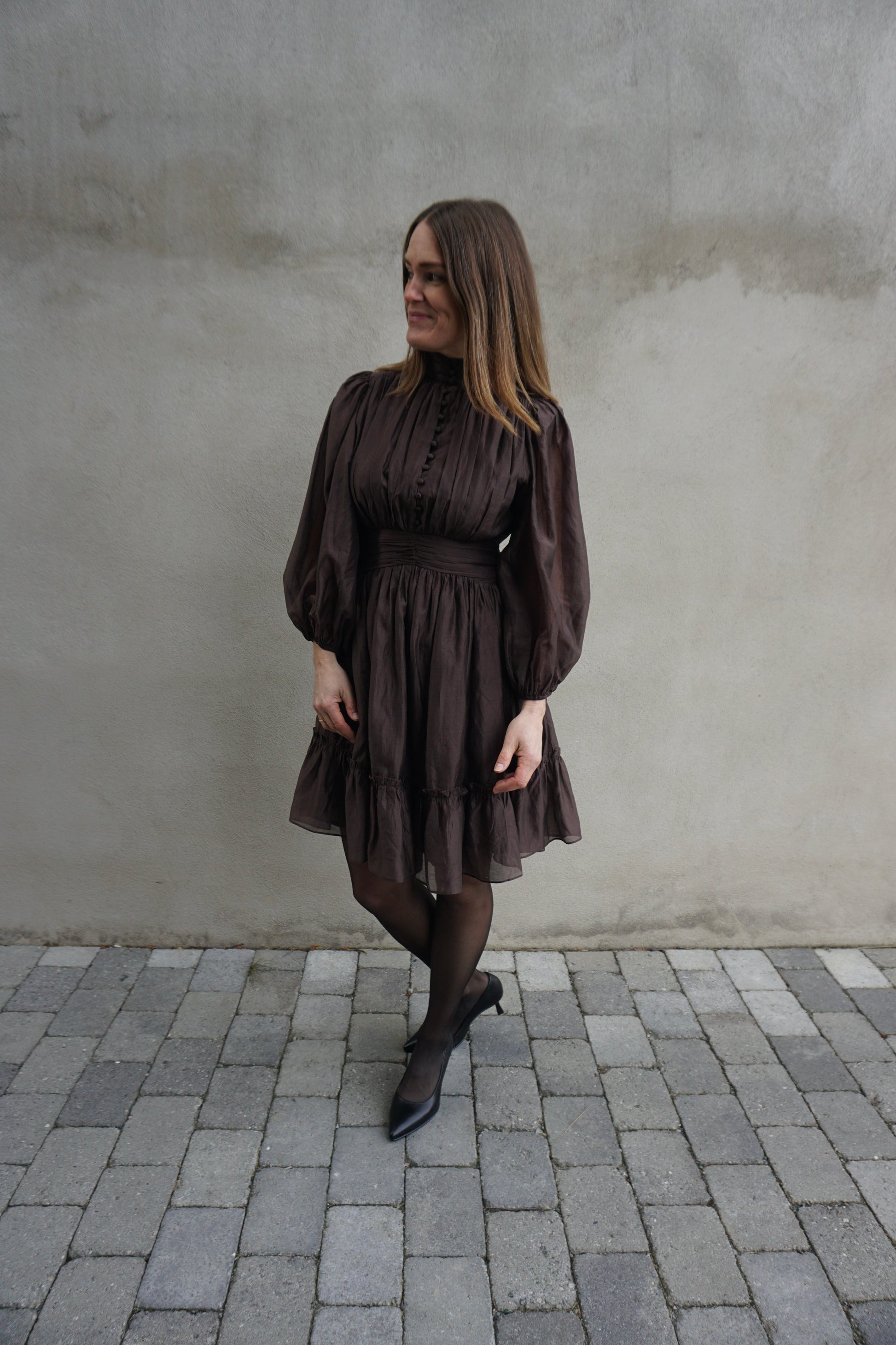 Kjolen har rynkedetaljer som gir et vakkert spill i stoffet, voluminøse 3/4-ermer og dekorative knapper i front som kan åpnes for å skape en mer feminin utringing. Den skjulte glidelåsen i siden gir en sømløs passform, mens underkjolen i bomull sørger for at kjolen føles behagelig hele dagen og kvelden.