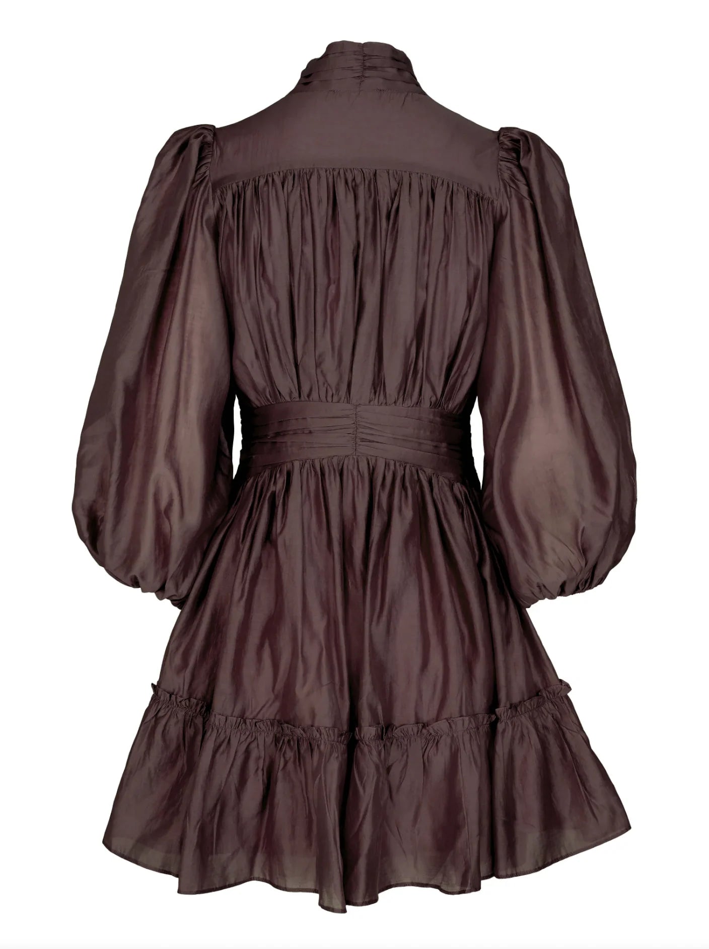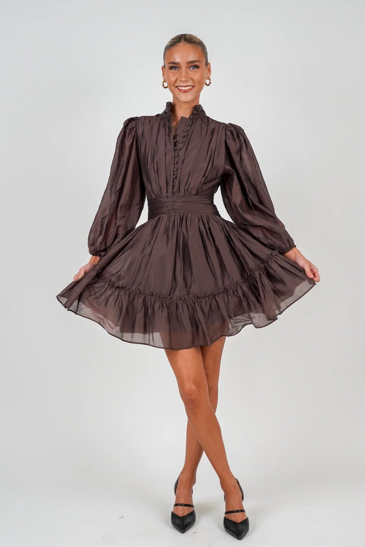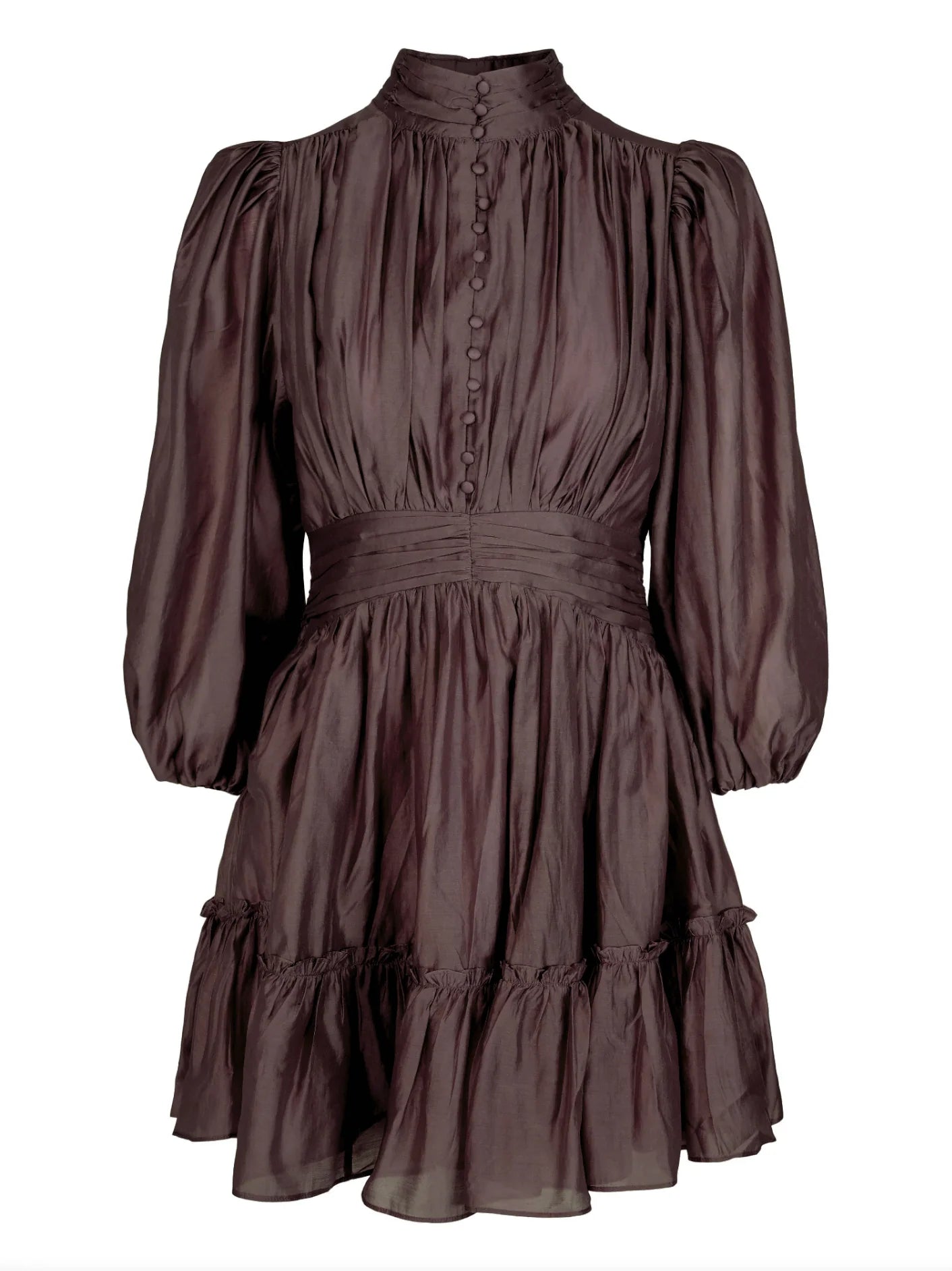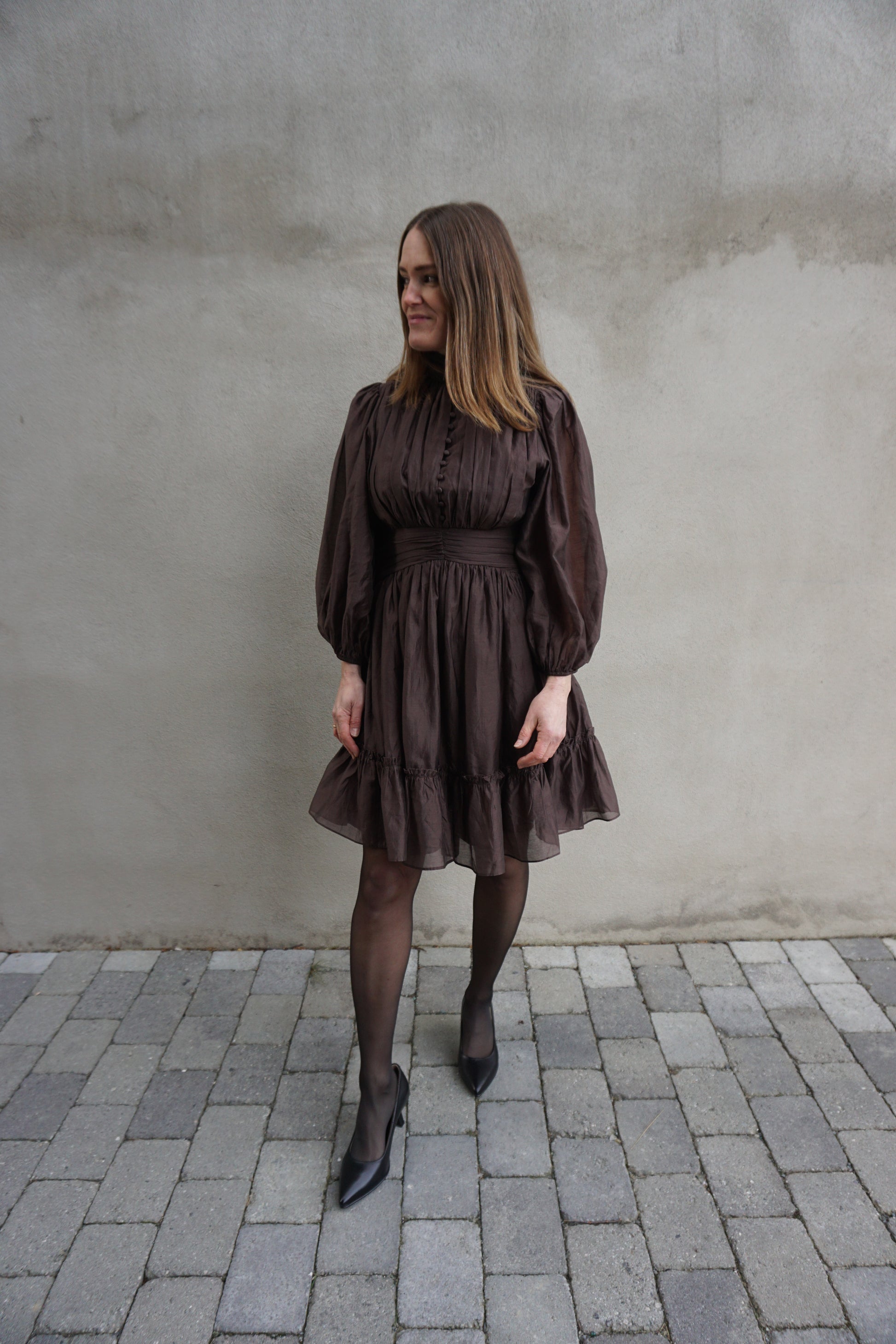 Kjolen har rynkedetaljer som gir et vakkert spill i stoffet, voluminøse 3/4-ermer og dekorative knapper i front som kan åpnes for å skape en mer feminin utringing. Den skjulte glidelåsen i siden gir en sømløs passform, mens underkjolen i bomull sørger for at kjolen føles behagelig hele dagen og kvelden.