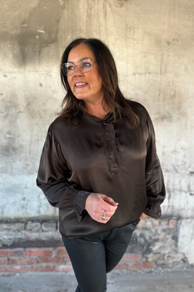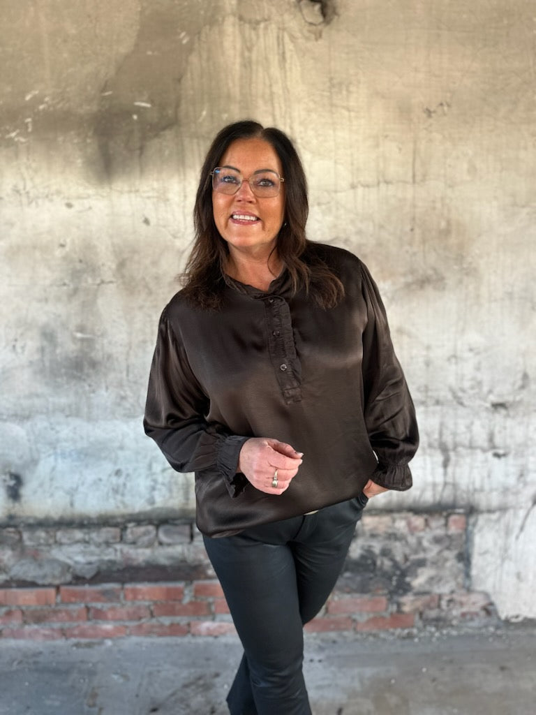 Gi garderoben din et løft med den sofistikerte Lora blusen fra Massimo. Denne vakre satengblusen i dyp brun farge kombinerer eleganse og komfort, og passer like godt til kontorantrekk som til festlige anledninger.