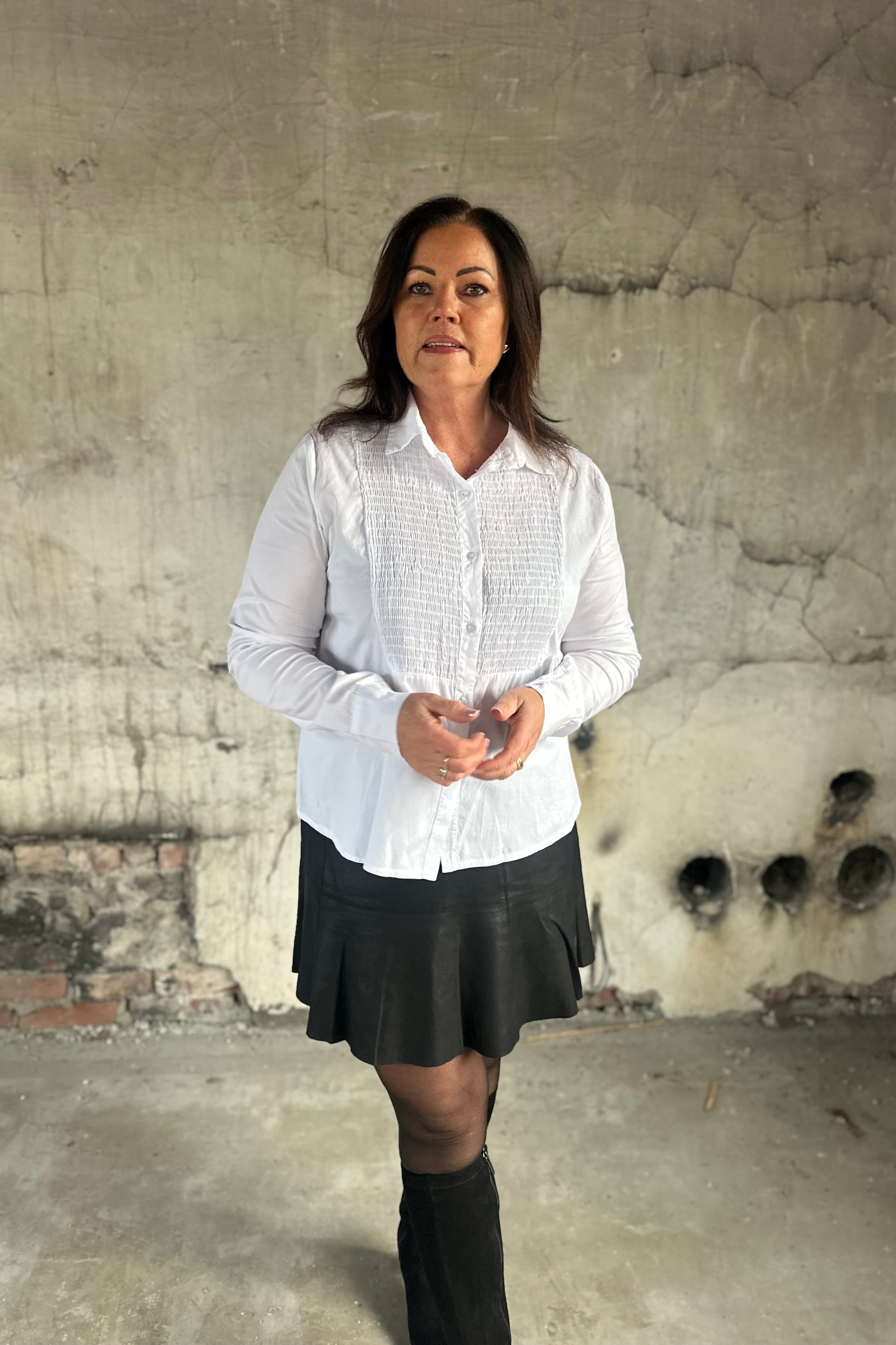 Blusen har delikate rynkedetaljer foran som gir et feminint og moderne uttrykk, samtidig som den klassiske kragen og knappelukkingen gjør den enkel å style både til jobb, hverdag og fest.