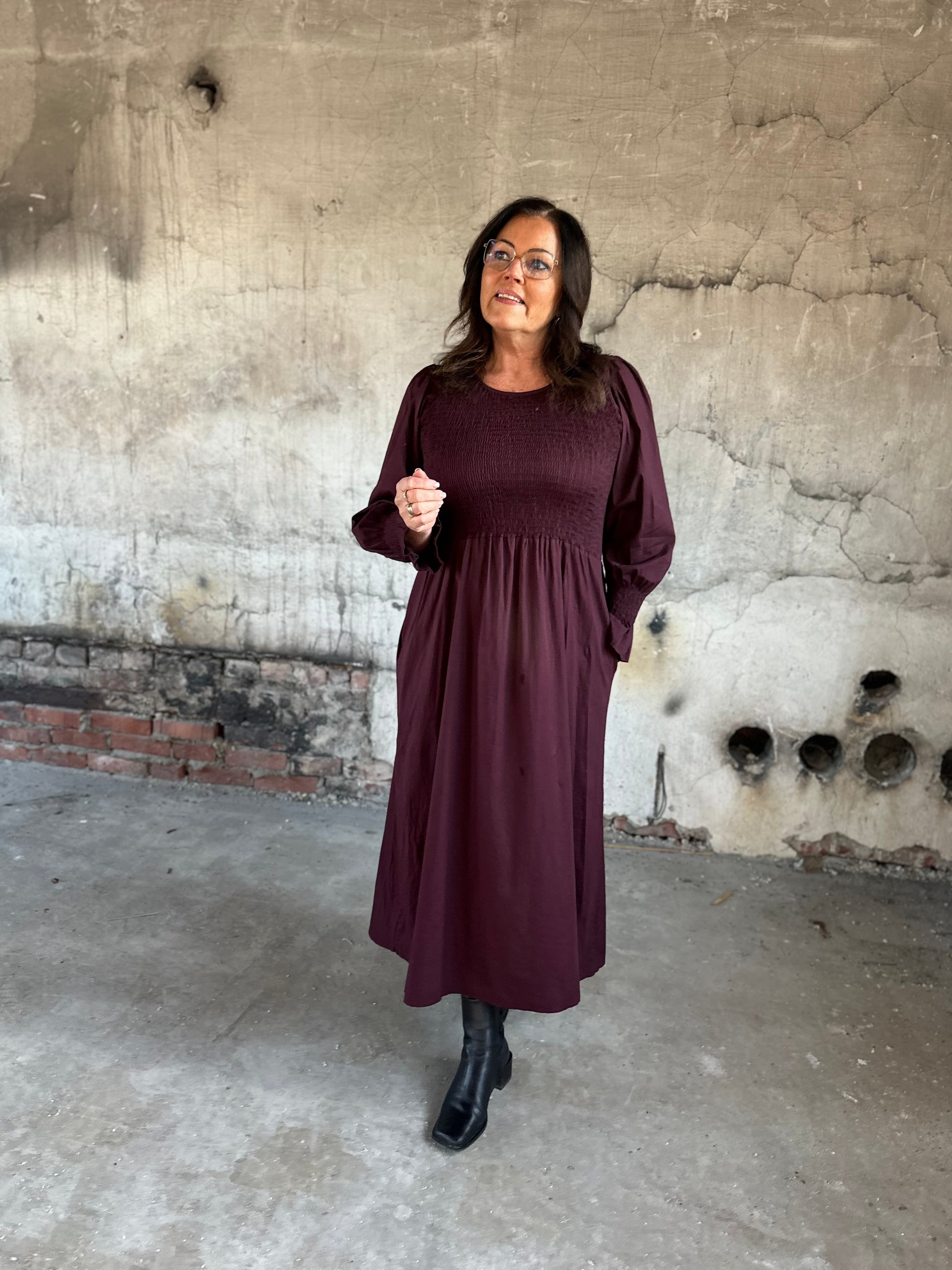 Den runde halsen og de lange puffermene med lett rynking gir et feminint uttrykk, mens den dype bordeauxfargen gir kjolen et elegant preg.
