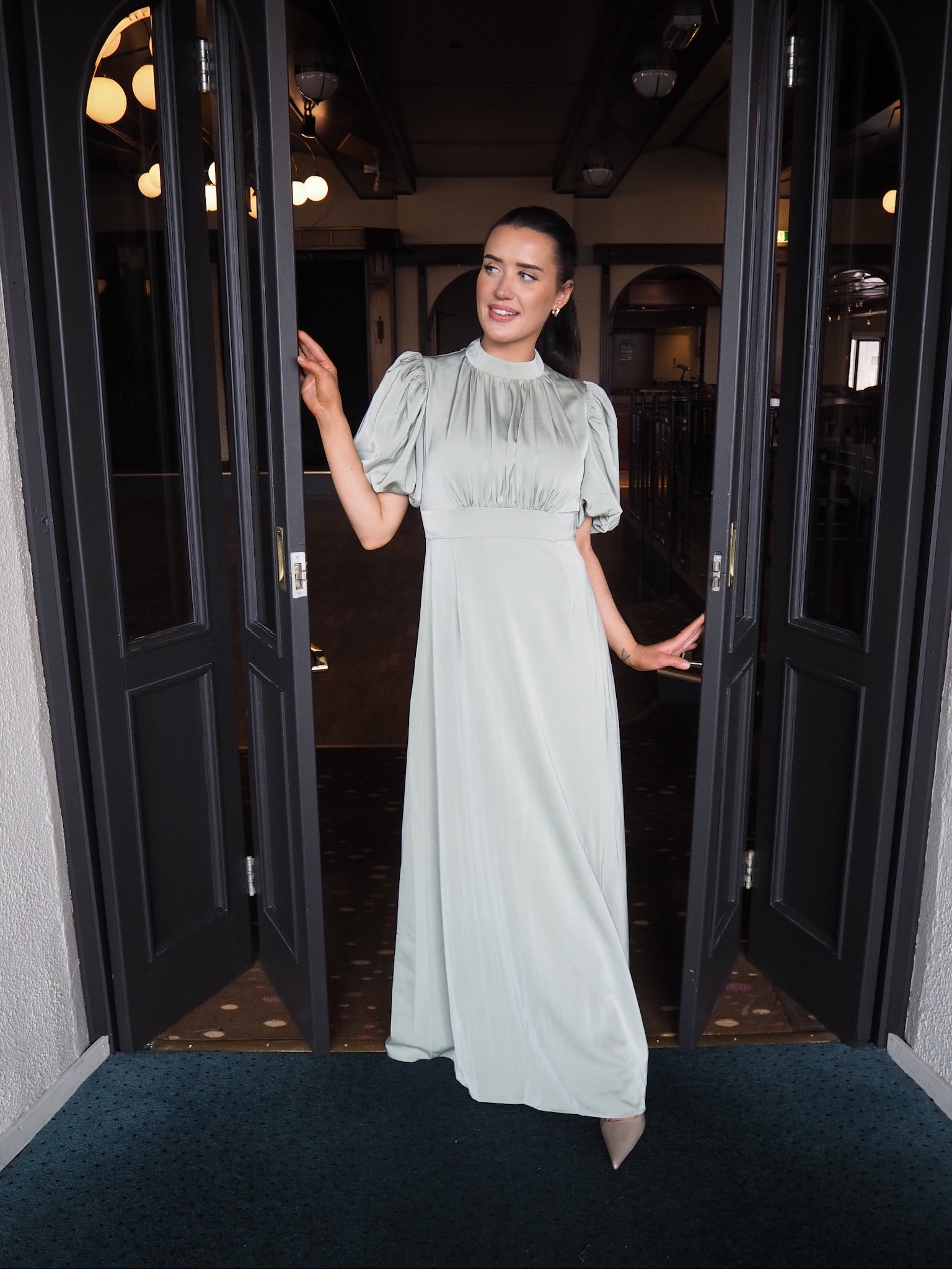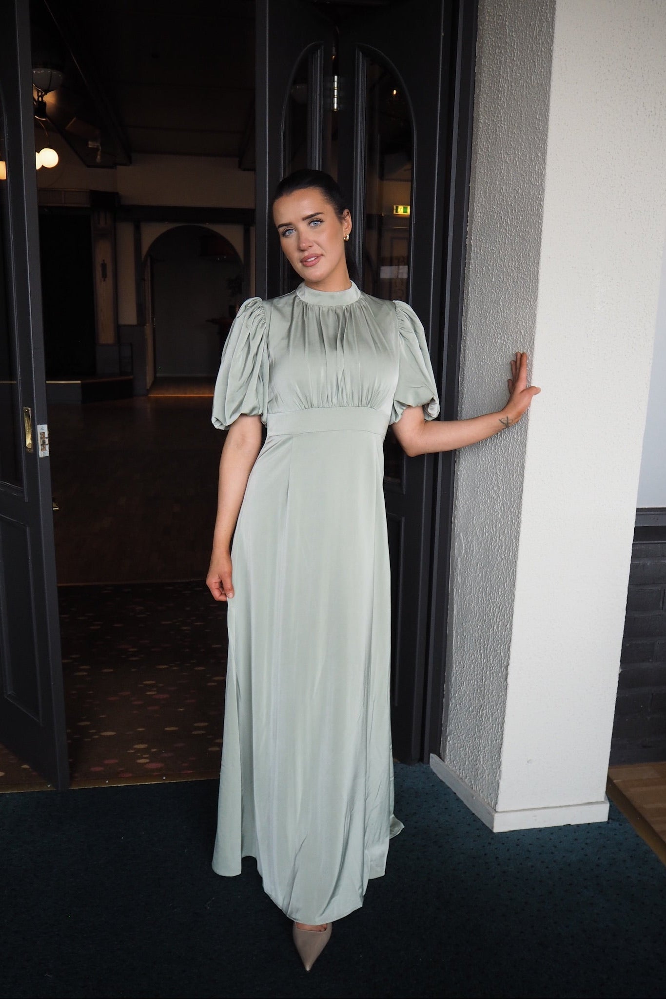 Kjolen har puffede ermer med lett volum, delikat rynking over brystet og et avtagbart belte som markerer midjen på en vakker måte.