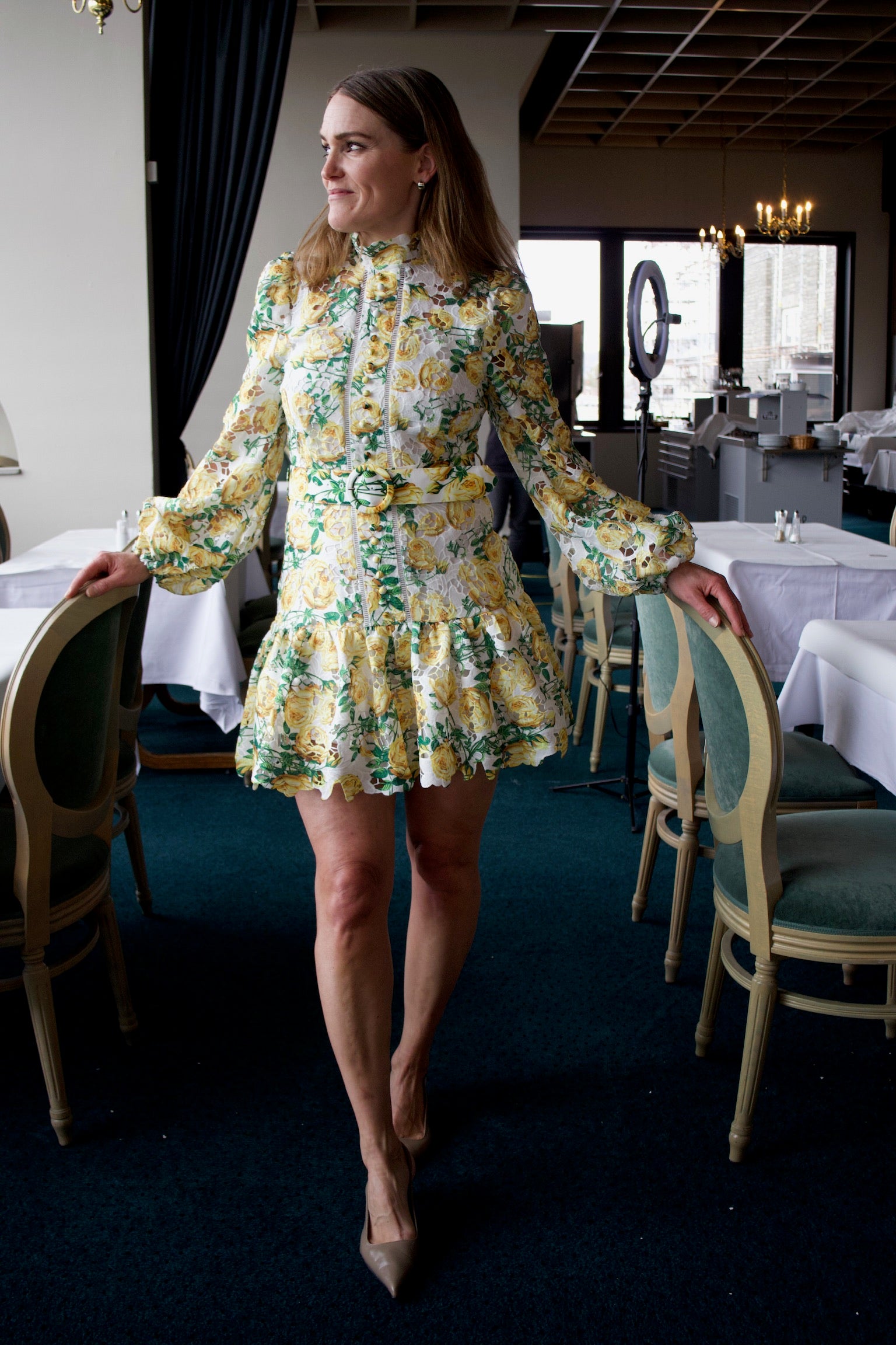De vakre gule rosene mot den lette stoffkvaliteten skaper en kjole som stråler av optimisme og feminin eleganse. Det detaljrike printet med grønne blader gir dybde og liv til designet, mens den tidløse Lovely-silhuetten sikrer at kjolen smigrer og sitter perfekt.Dette er kjolen som får deg til å føle deg vakker og sommerklar – enten du skal på bryllup, konfirmasjon, hagefest eller bare nyte en solskinnsdag.