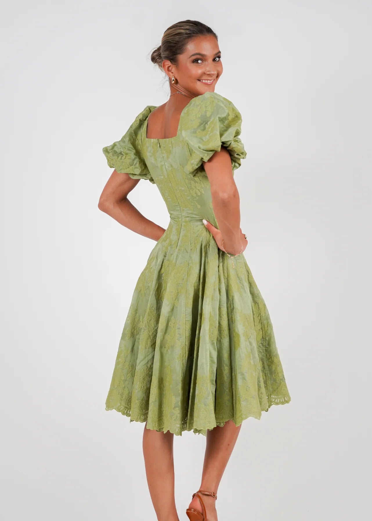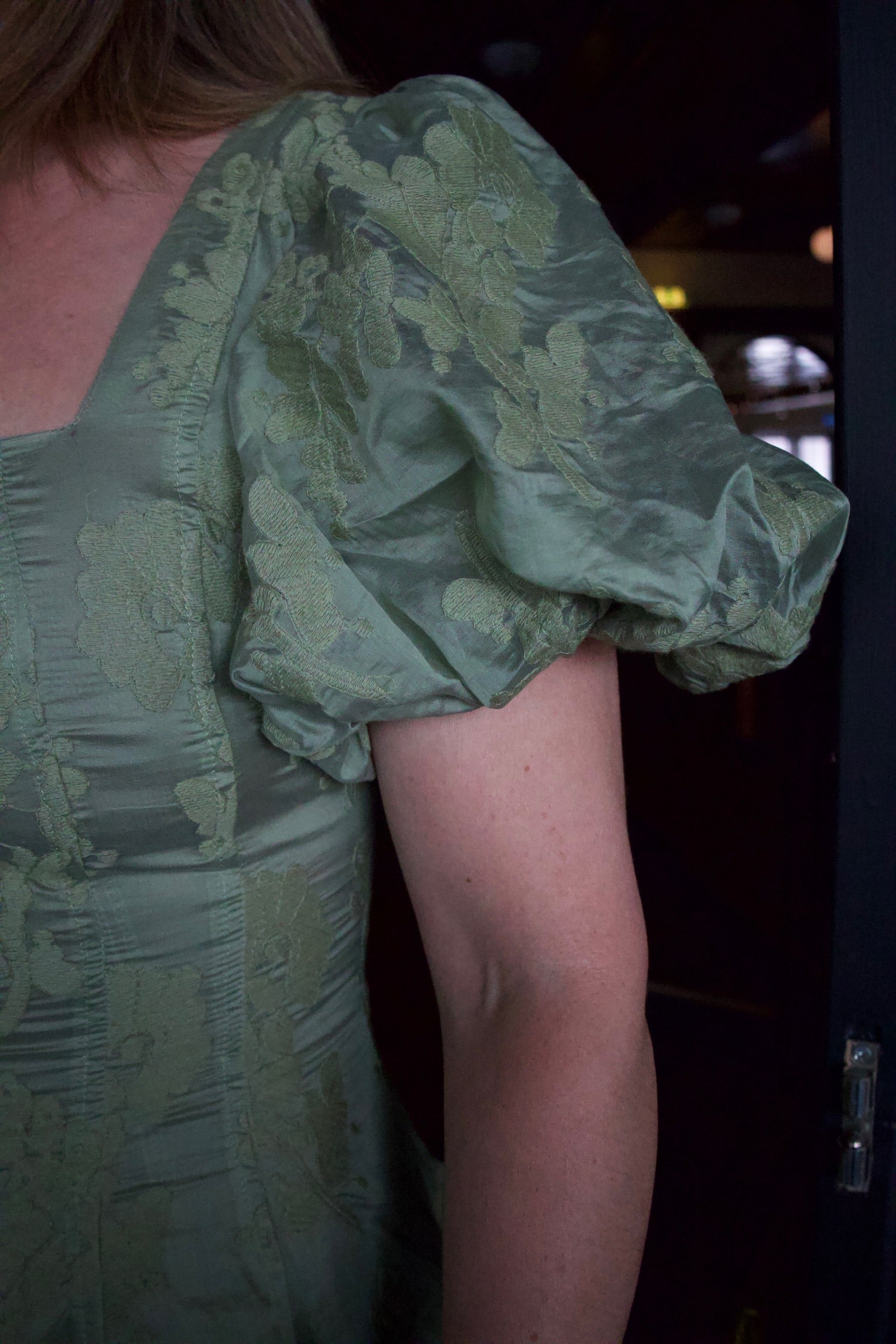 Kjolen har en elegant utringing både i front og rygg, og er utstyrt med skjult glidelås i ryggen for et sømløst uttrykk. De delikate blondene med sitt vakre mønster gir kjolen et luksuriøst preg, mens strikk under en liten puff i ermene skaper de nydelige skulderdetaljene som setter prikken over i-en.