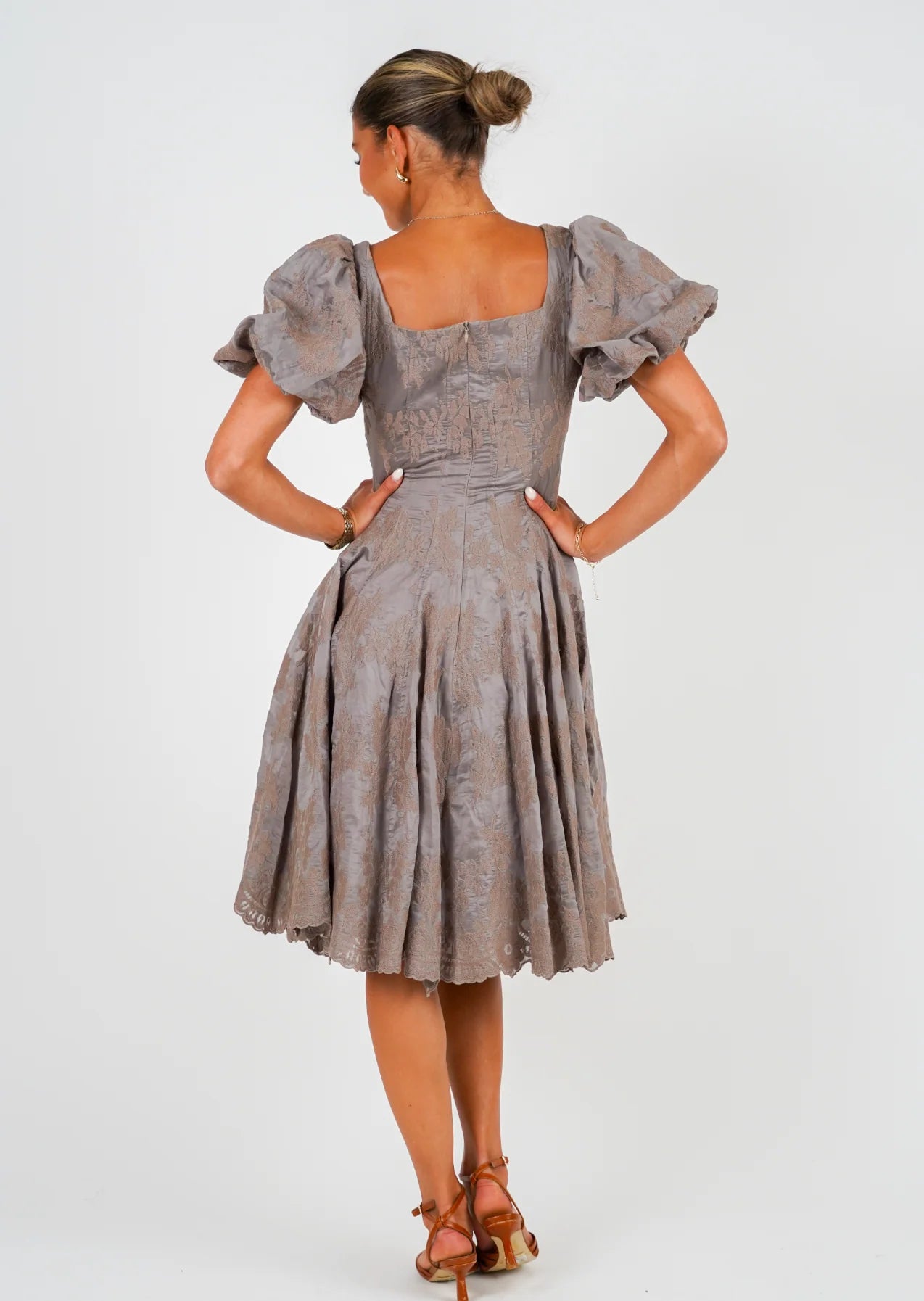 Kjolen har en elegant utringing både i front og rygg, og er utstyrt med skjult glidelås i ryggen for et sømløst uttrykk. De delikate blondene med sitt vakre mønster gir kjolen et luksuriøst preg, mens strikk under en liten puff i ermene skaper de nydelige skulderdetaljene som setter prikken over i-en.