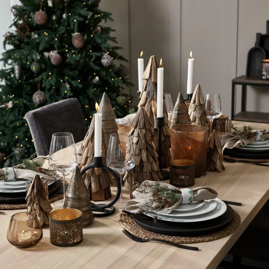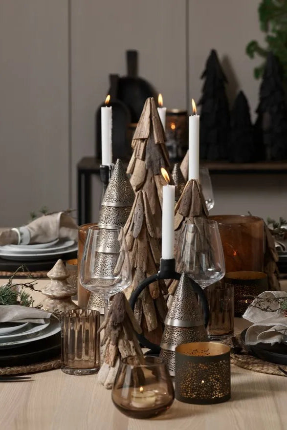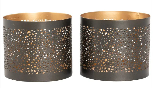 Lyslyktene er i brun perforert metall, og gull innside som gjør at lyslyktene lager et flott spill når lysene er tent.