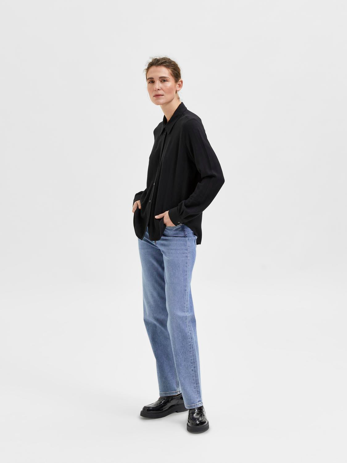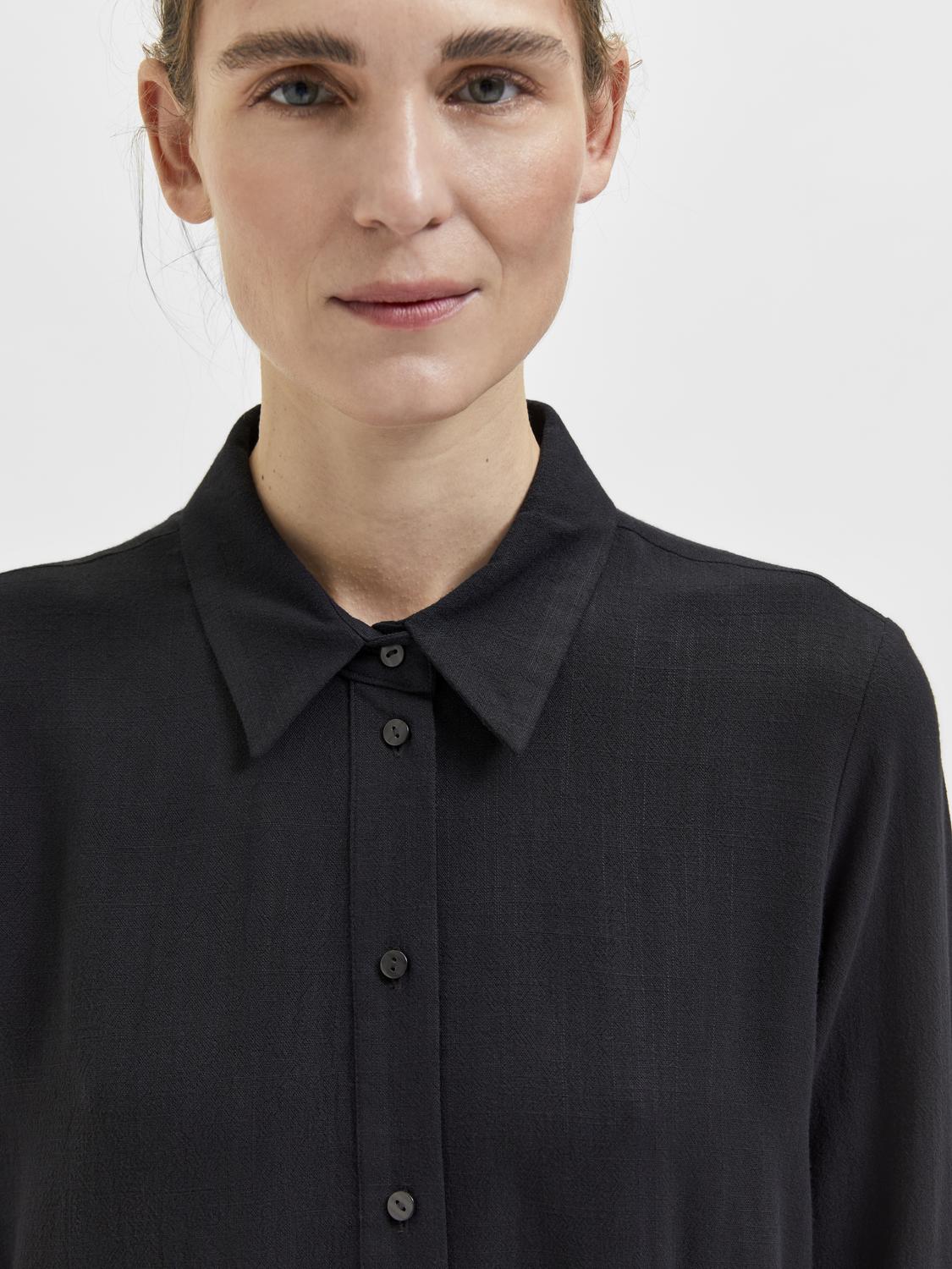- Detaljer: Skjortekrage, lange ermer med mansjettknapper, knappelukking og buet fald.