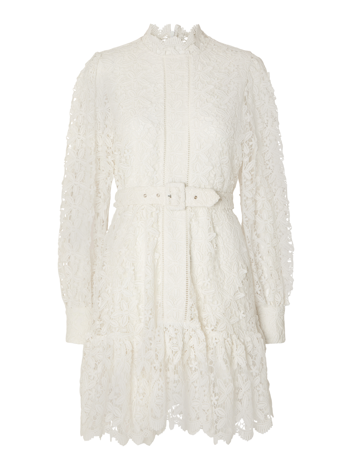 SLFSILJA LS EMBROIDERY SHORT DRESS SOLID er en elegant kjole i klar hvit, perfekt for spesielle anledninger. Den feminine blondedetaljen og belte i midjen gir en flatterende silhuett, mens de lange ermene og den høye halsen tilfører et sofistikert preg.